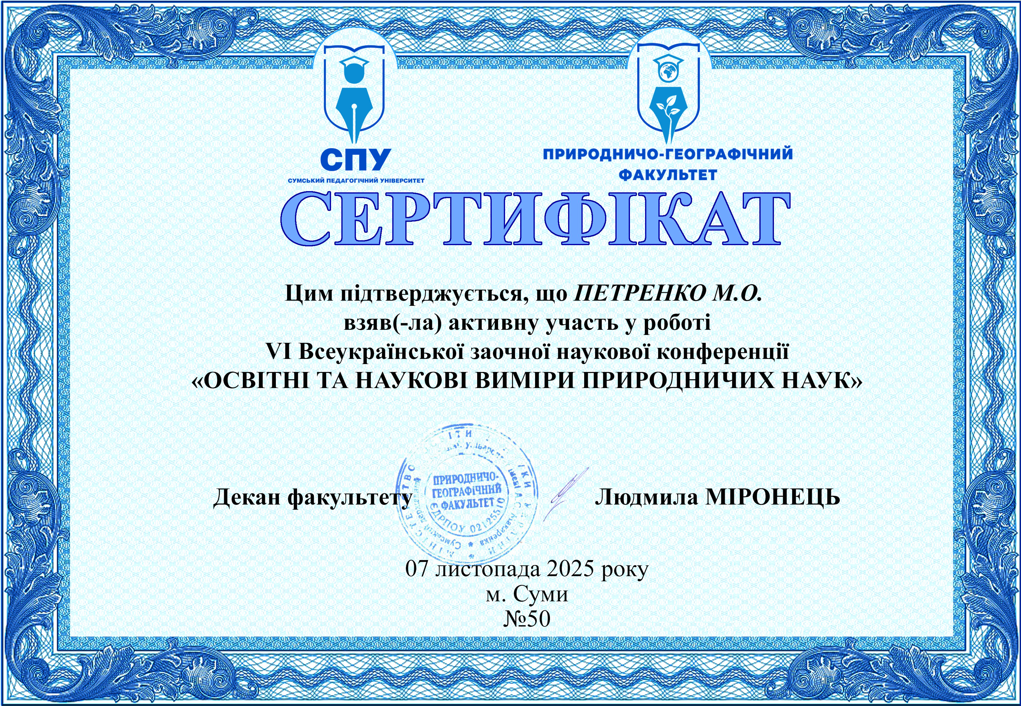 Здобувачі освіти освіти – члени студентських наукових проблемних груп кафедри загальної та регіональної географії взяли активну участь у роботі VI Всеукраїнської заочної наукової конференції «Освітні та наукові виміри природничих наук», присвяченої 95-річчю заснування природничо-географічного факультету Сумського державного педагогічного університету імені А. С. Макаренка