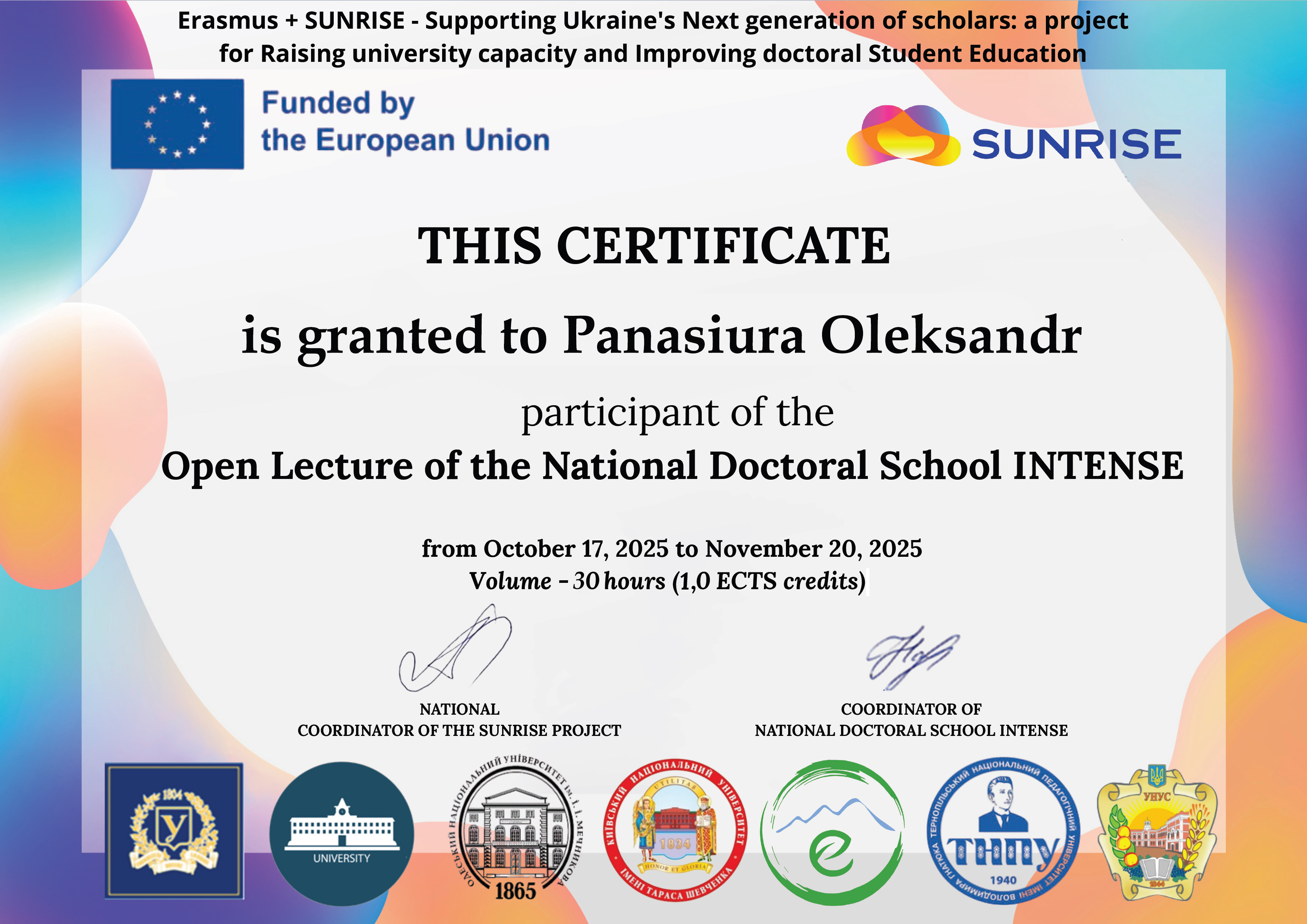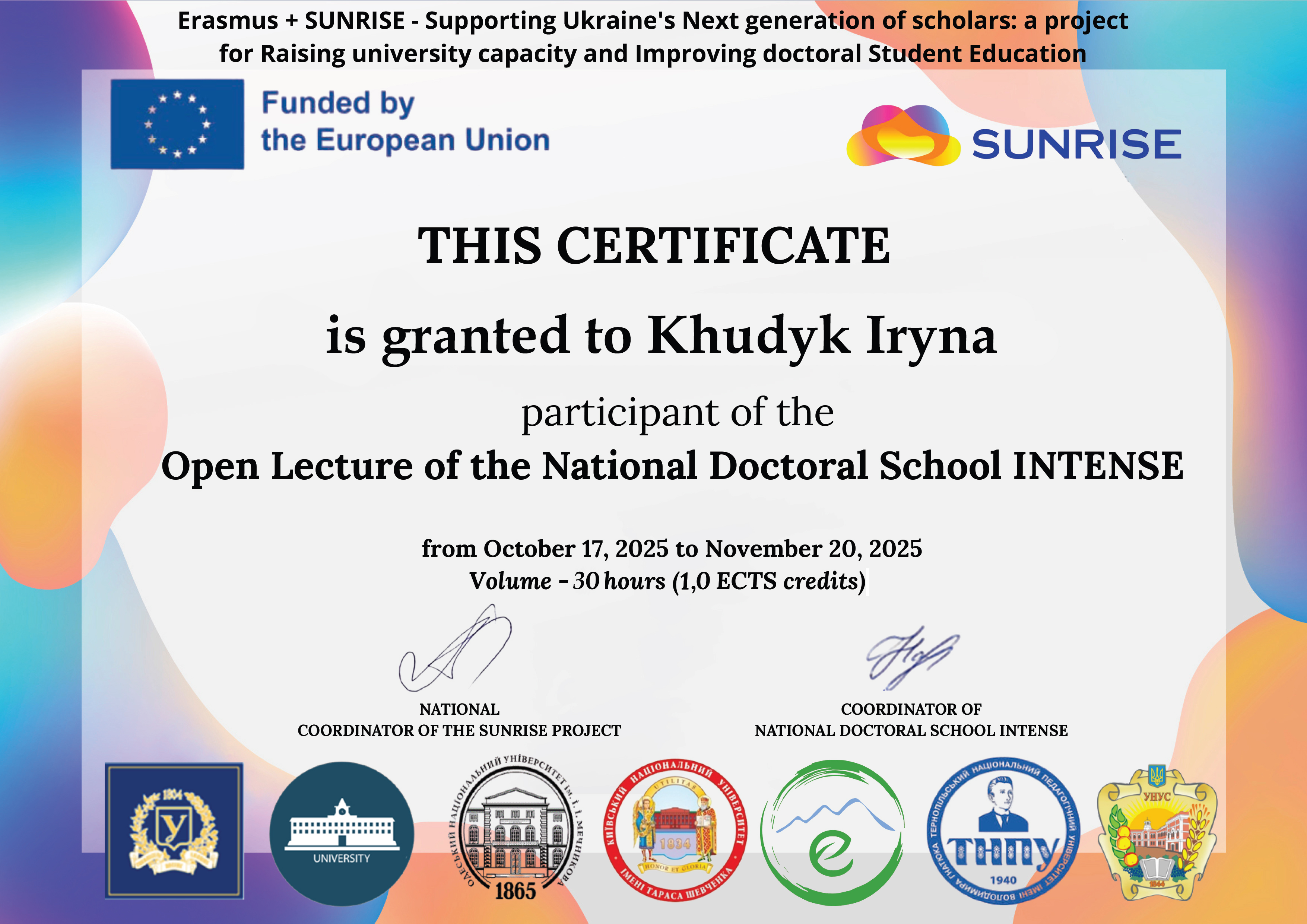 Впродовж І семестру 2025-26 навчального року магістранти спеціальності А4 Середня освіта (Географія) відвідували онлайн лекторій в рамках Національної докторської школи INTENSE, що підтримується проєктом Ерасмус+ SUNRISE. Здобувачі освіти успішно опанували програму лекторію, про що було отримано відповідні сертифікати.