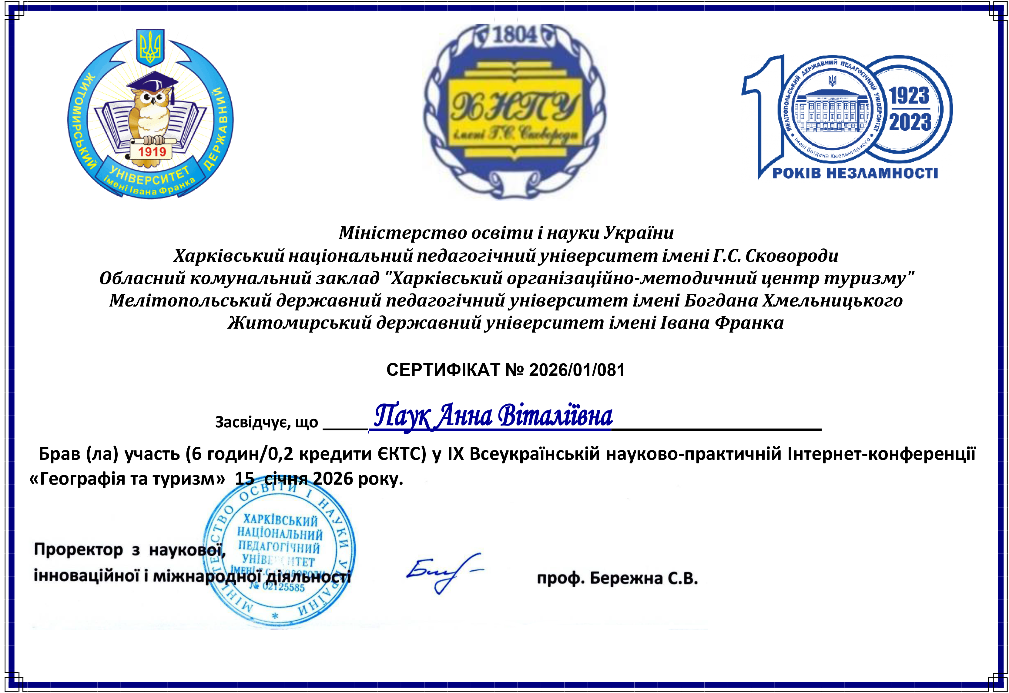 Учасниця проблемної наукової групи з фізичної географії, картографії та туризму А.В. Паук (753 група) взяла участь у роботі ІХ Всеукраїнської науково-практичної Інтернет-конференції «Географія та туризм». Конференція, яка є щорічним науковим заходом і традиційно об’єднує широке коло науковців, викладачів і практиків у галузі географії та туризму з різних регіонів України, проходила 15 січня 2026 року на базі Харківського національного педагогічного університету імені Г. С. Сковороди.