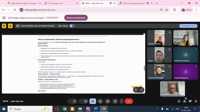 Учасники заходу обговорили заходи академічної відповідальності, передбачені законодавством за порушення встановлених вимог. Було наголошено на важливості дотримання принципів академічної етики як обов'язкової умови для отримання відповідної кваліфікації та формування професійної репутації здобувачів.