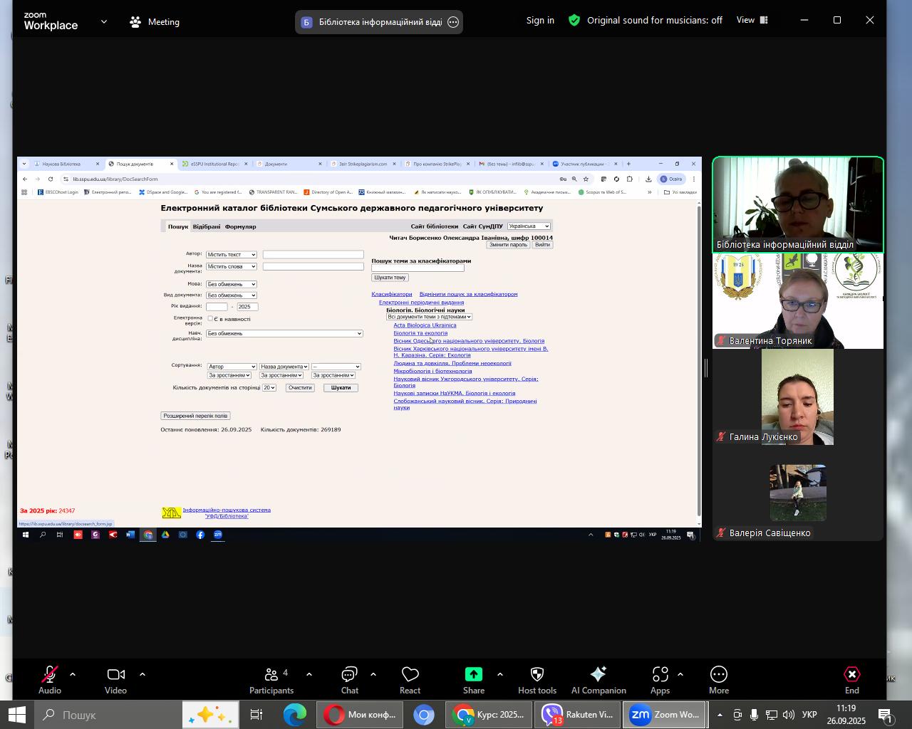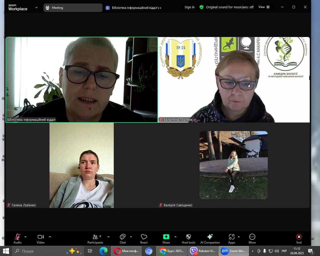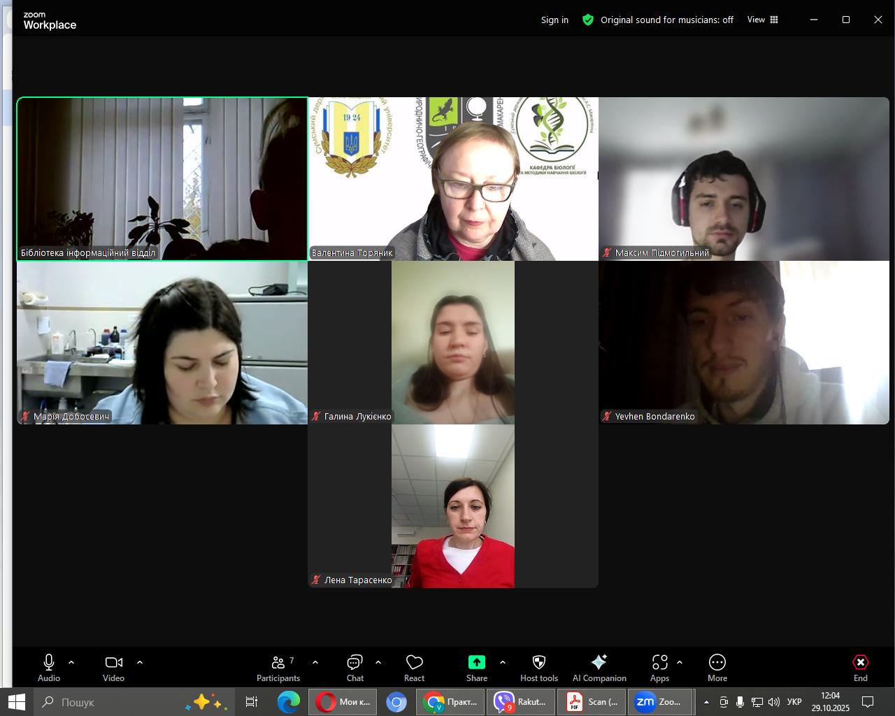 З кінця вересня до початку листопада 2025 р. з метою підвищення якості підготовки здобувачів освіти другого (магістерського) рівня з навчальних дисциплін «Методологія та організація наукових досліджень» (652 гр., спеціальність А4.05 Середня освіта (Біологія та здоров’я людини)) та «Методологія наукових досліджень в біології» (854 гр., спеціальність Е1 Біологія та біохімія), що є обов’язковими освітніми компонентами відповідних освітніх програм, відбувалися онлайн-зустрічі з завідувачкою відділу інформаційних технологій та комп’ютерного забезпечення наукової бібліотеки СумДПУ імені А.С. Макаренка Олександрою Борисенко.