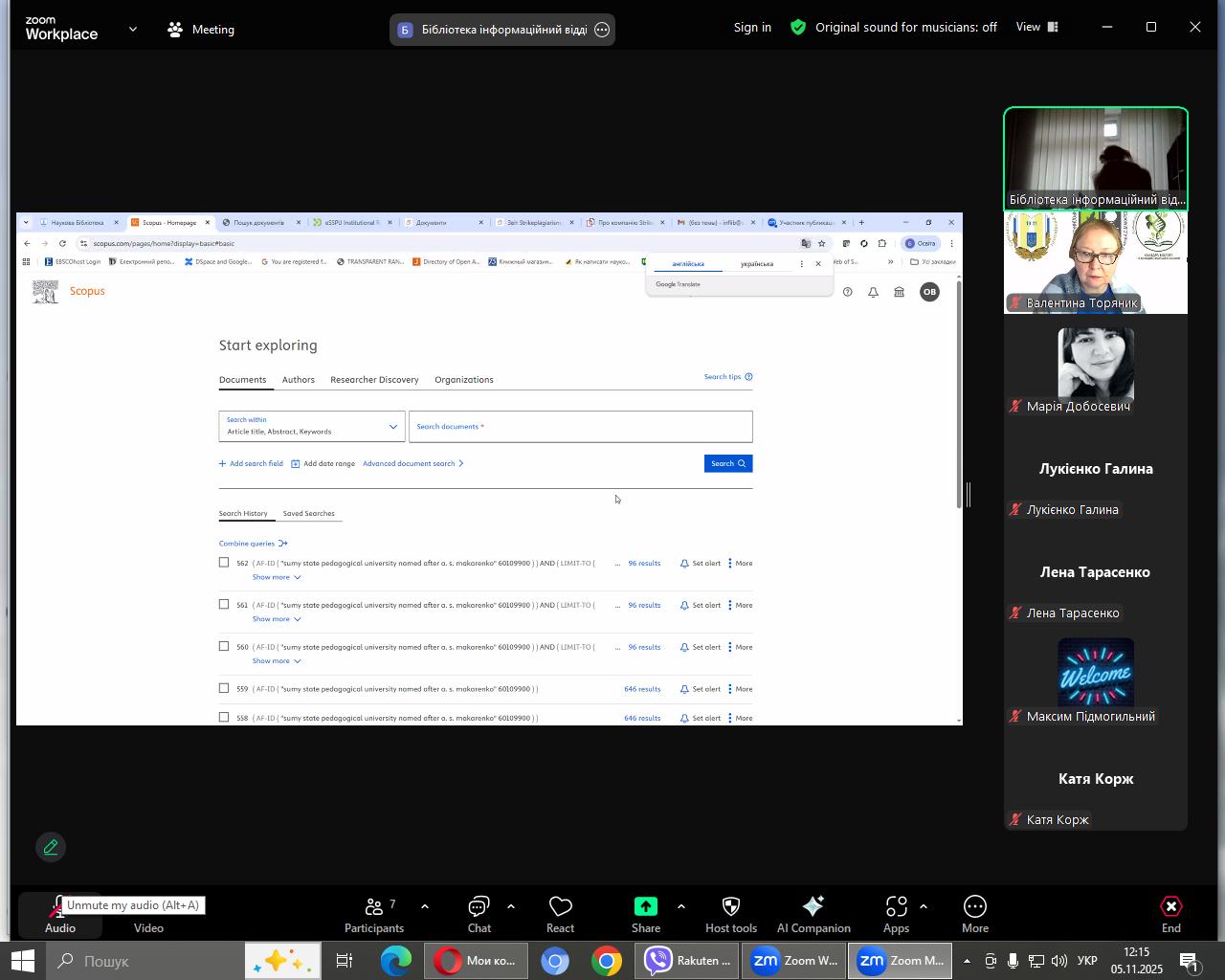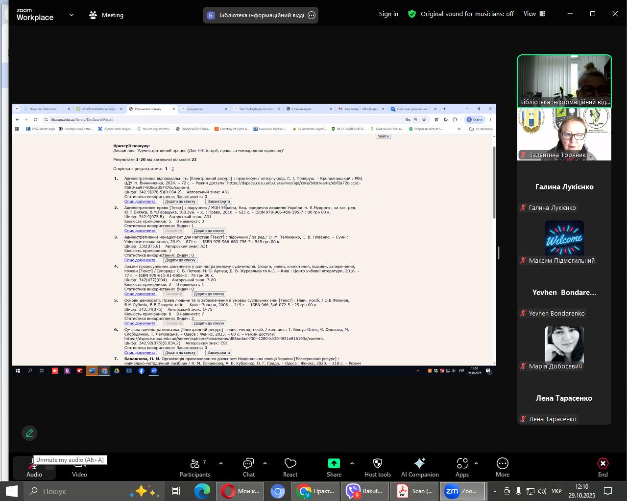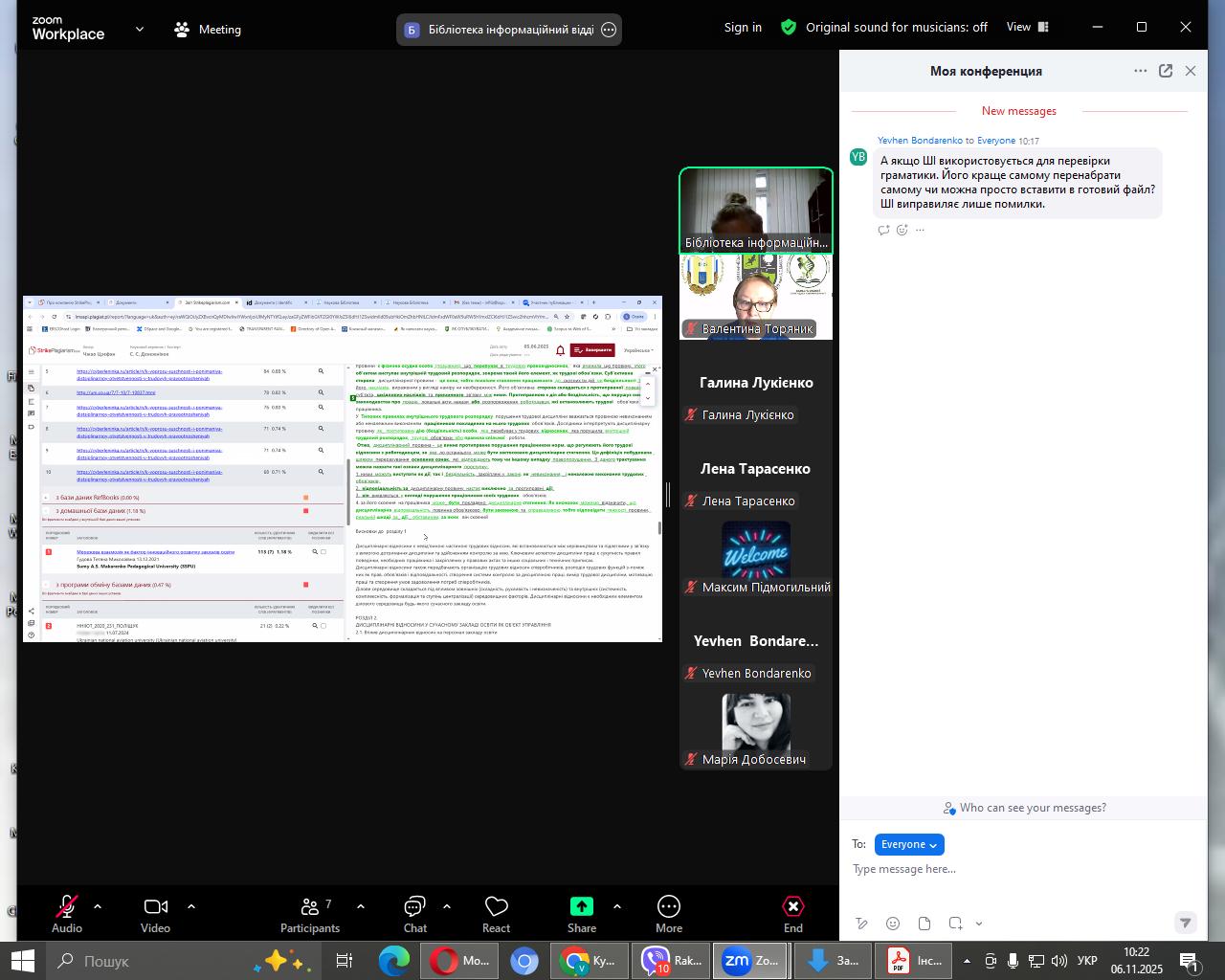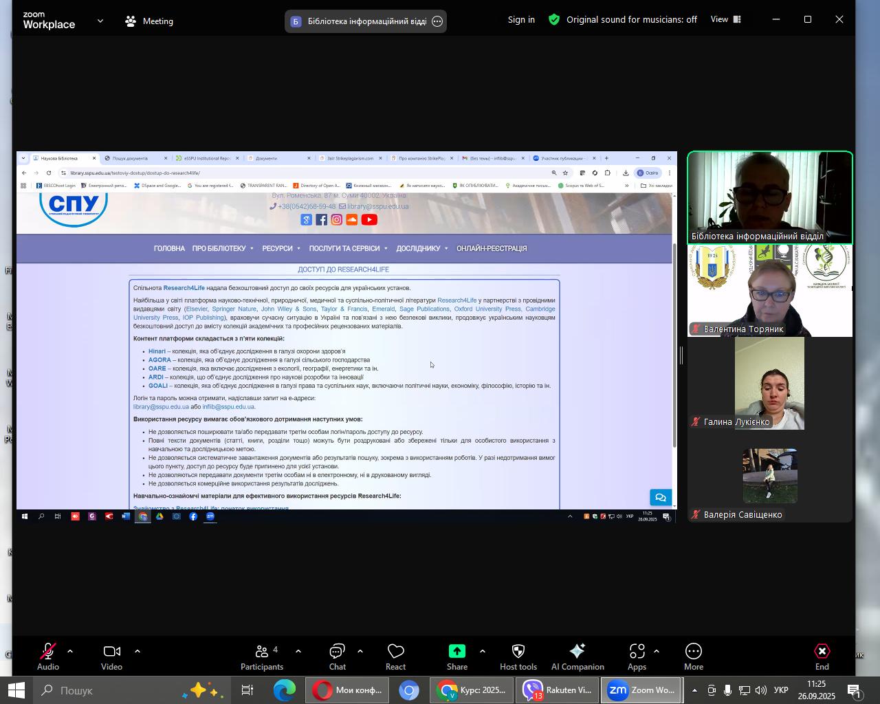 З кінця вересня до початку листопада 2025 р. з метою підвищення якості підготовки здобувачів освіти другого (магістерського) рівня з навчальних дисциплін «Методологія та організація наукових досліджень» (652 гр., спеціальність А4.05 Середня освіта (Біологія та здоров’я людини)) та «Методологія наукових досліджень в біології» (854 гр., спеціальність Е1 Біологія та біохімія), що є обов’язковими освітніми компонентами відповідних освітніх програм, відбувалися онлайн-зустрічі з завідувачкою відділу інформаційних технологій та комп’ютерного забезпечення наукової бібліотеки СумДПУ імені А.С. Макаренка Олександрою Борисенко.