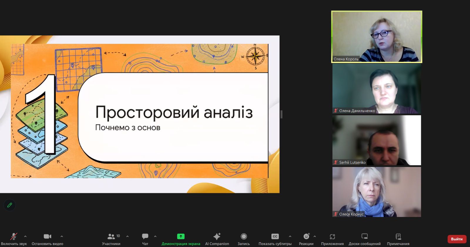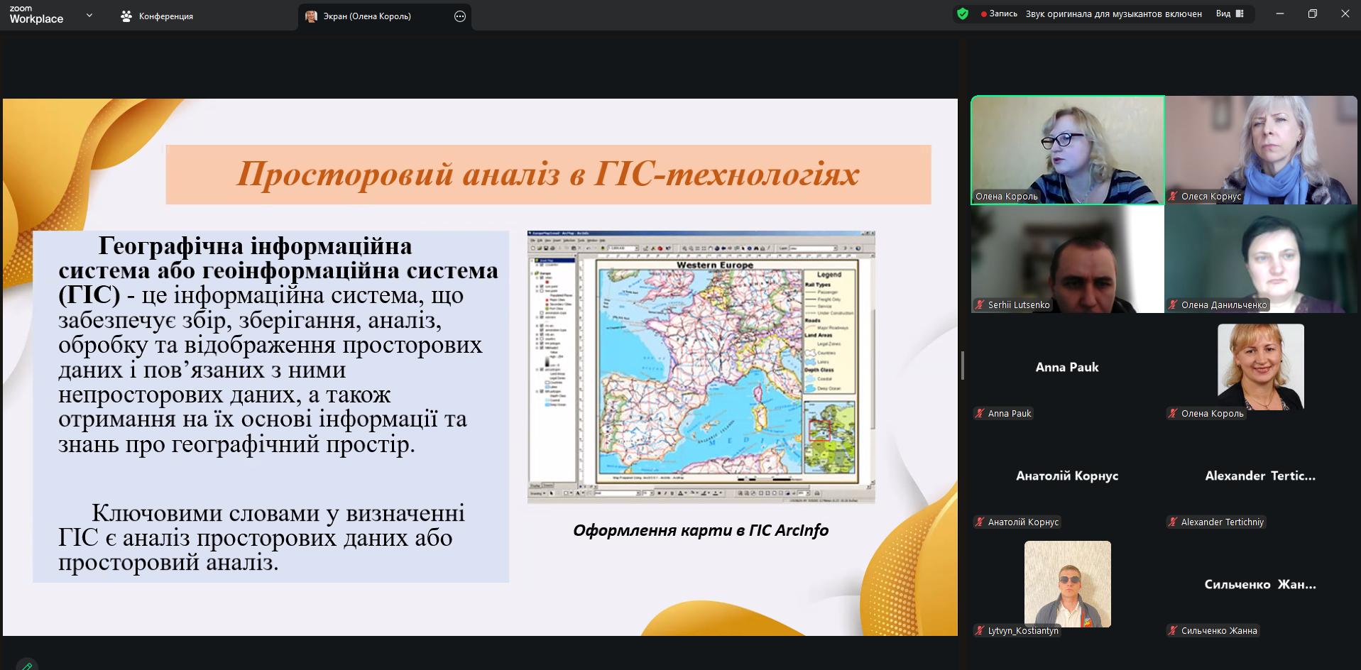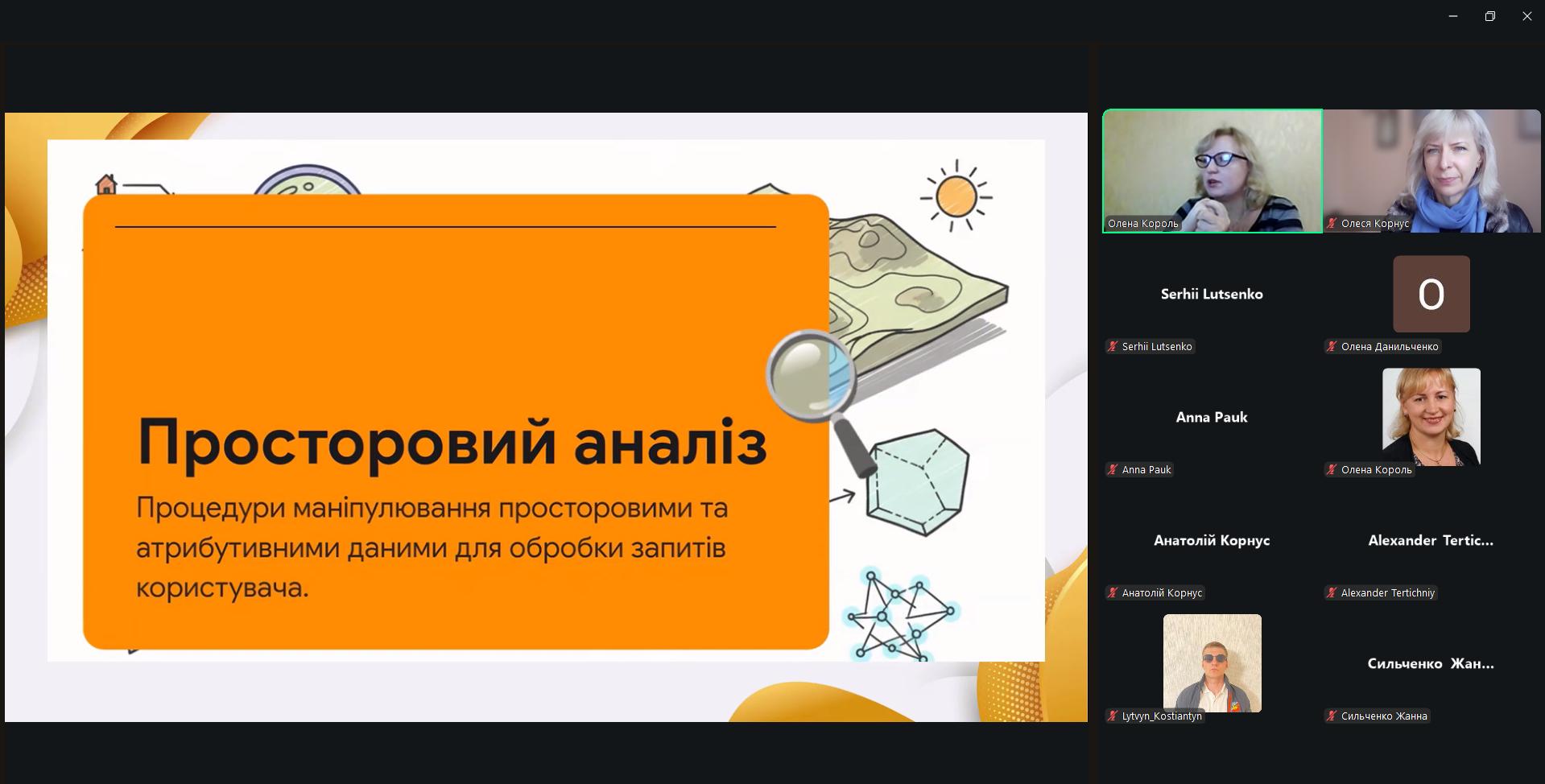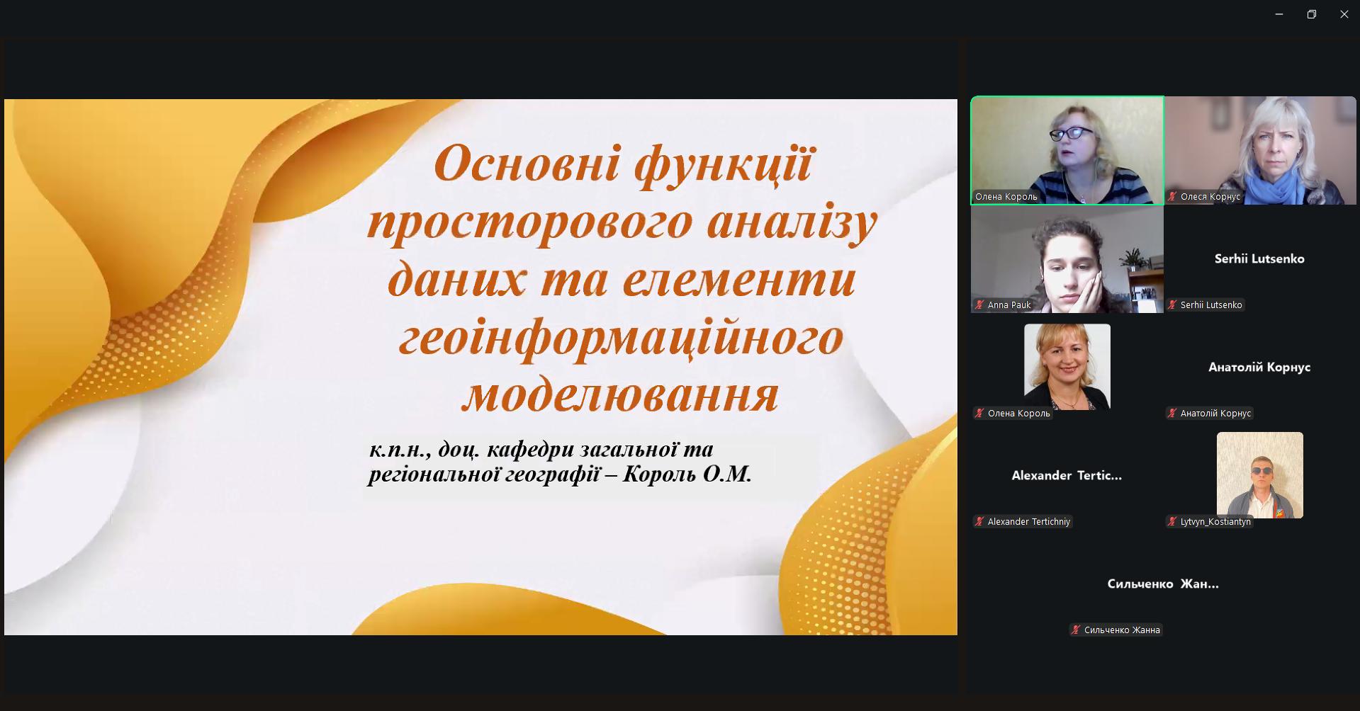 10 листопада к.п.н., доцент кафедри загальної та регіональної географії Олена КОРОЛЬ в режимі онлайн провела відкриту лекцію з дисципліни «Географічний аналіз і візуалізація в ГІС» для здобувачів освіти другого (магістерського) рівня 753 групи спеціальності Е4 Науки про Землю Освітньої програми «Геопросторові науки. Геоінформаційні технології» на тему «Оcнoвнi фyнкцiï пpocтopoвoгo aнaлiзy дaниx та елементи геоінформаційного моделювання».