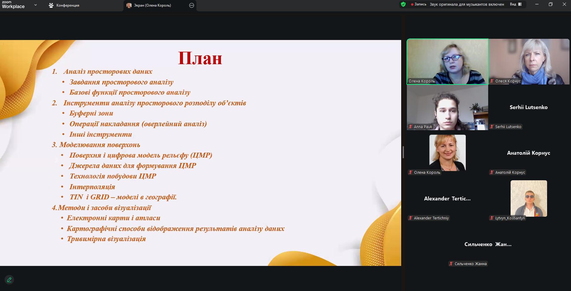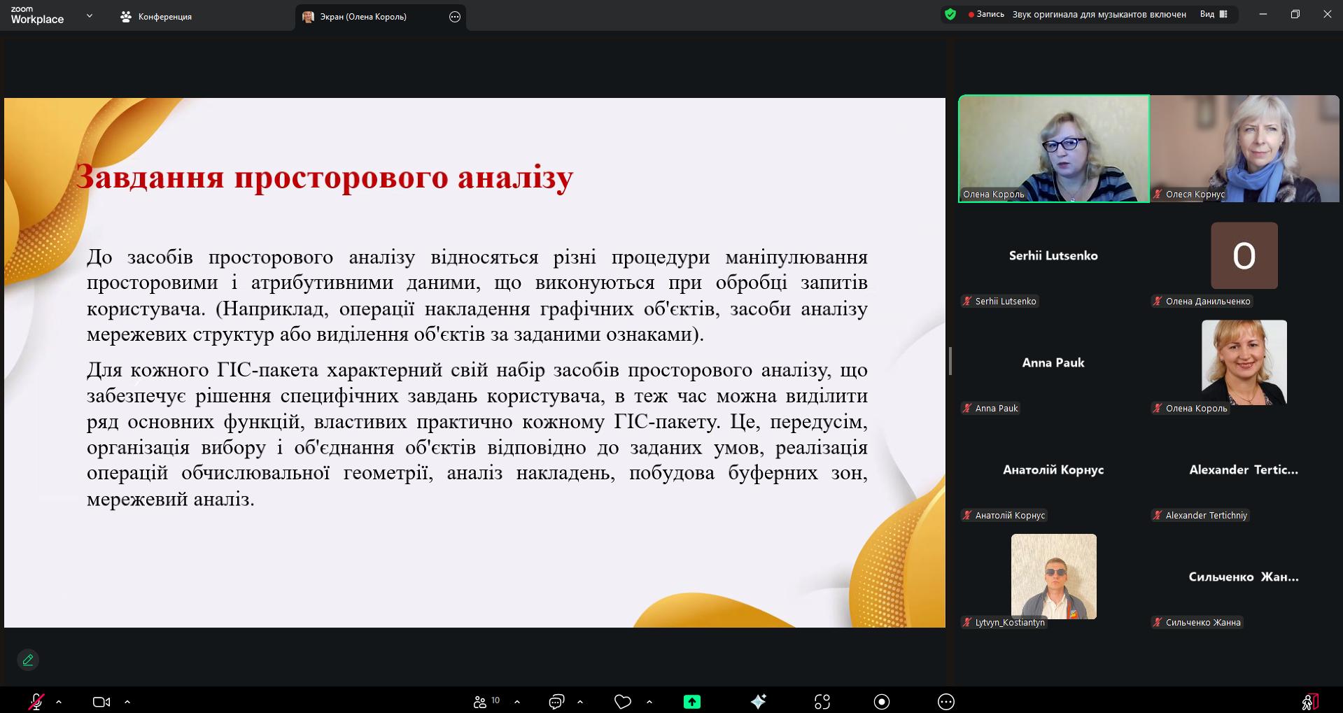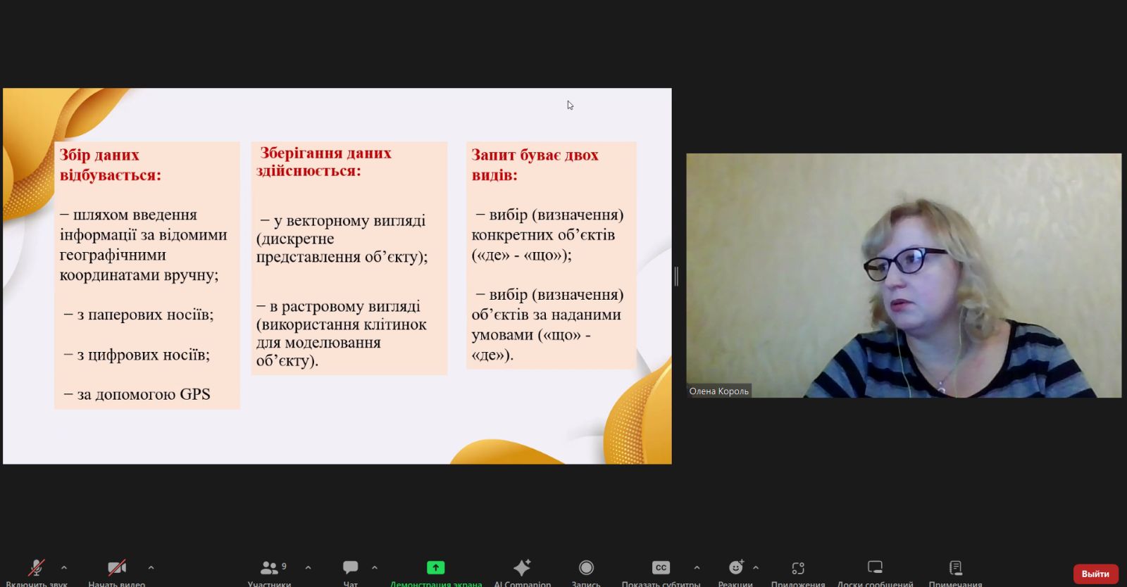 10 листопада к.п.н., доцент кафедри загальної та регіональної географії Олена КОРОЛЬ в режимі онлайн провела відкриту лекцію з дисципліни «Географічний аналіз і візуалізація в ГІС» для здобувачів освіти другого (магістерського) рівня 753 групи спеціальності Е4 Науки про Землю Освітньої програми «Геопросторові науки. Геоінформаційні технології» на тему «Оcнoвнi фyнкцiï пpocтopoвoгo aнaлiзy дaниx та елементи геоінформаційного моделювання».