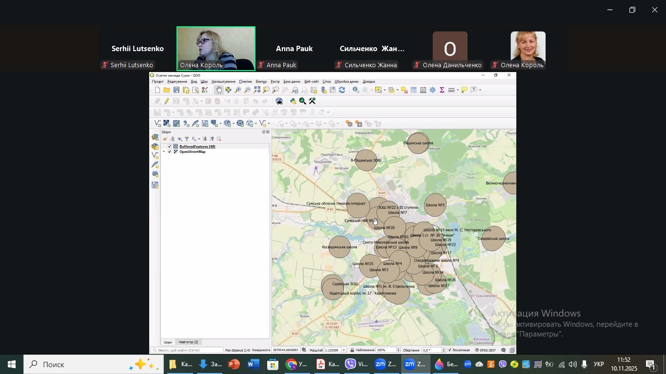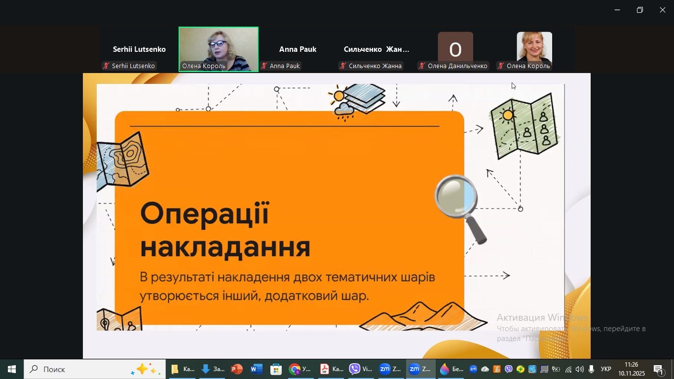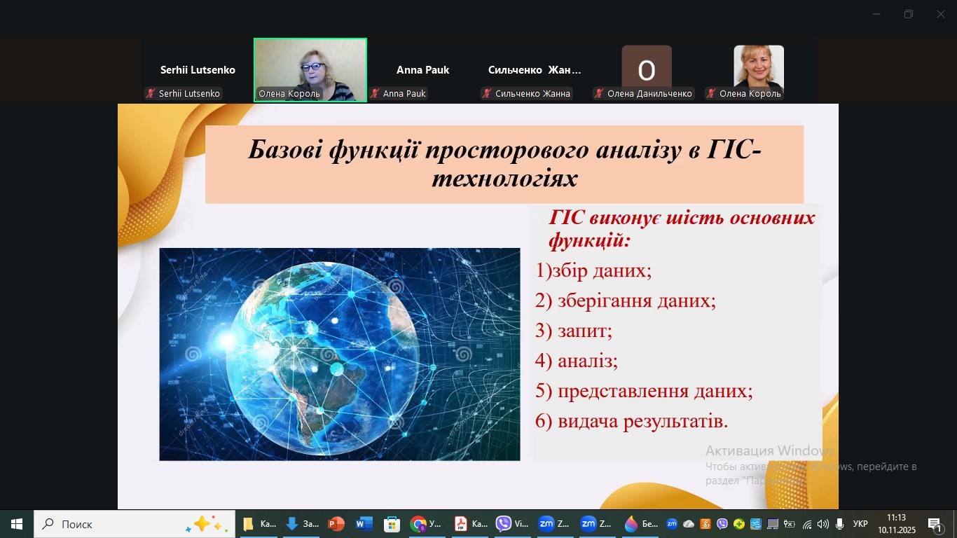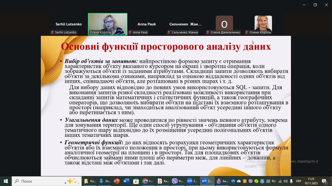 10 листопада к.п.н., доцент кафедри загальної та регіональної географії Олена КОРОЛЬ в режимі онлайн провела відкриту лекцію з дисципліни «Географічний аналіз і візуалізація в ГІС» для здобувачів освіти другого (магістерського) рівня 753 групи спеціальності Е4 Науки про Землю Освітньої програми «Геопросторові науки. Геоінформаційні технології» на тему «Оcнoвнi фyнкцiï пpocтopoвoгo aнaлiзy дaниx та елементи геоінформаційного моделювання».