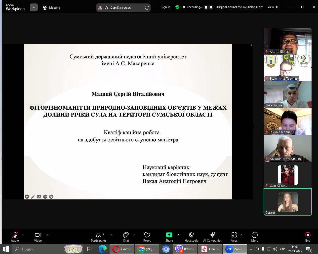 25 листопада 2025 року викладачі кафедри біології та методики біології, доценти Міронець Л.П., Москаленко М.П. та Торяник В.М., та здобувачі вищої освіти ОП Середня освіта (Хімія) долучилися до заходів з нагоди Дня кафедри ботаніки і методики викладання природничих наук Волинського національного університету імені Лесі Українки і прослухали доповідь Броннікової Лариси Іванівни – аспірантки 4-го року навчання кафедри фiзioлогiï та iнтродукцiï рослин бioлого-екологiчного факультету Днiпровського нацioнального унiверситету Олеся Гончара, молодшого наукового спiвробiтника вiддiлу генетичноï iнженерiï Iнституту фiзioлогiï pоcлин i генетики НАН Укрaïни, на тему: «Клiтинна селекцiя з ioнами важких металiв та фiзioлогiчнi механiзми стiйкостi лiнiй Nicotiana tabacum L. до водно-сольового стресу».