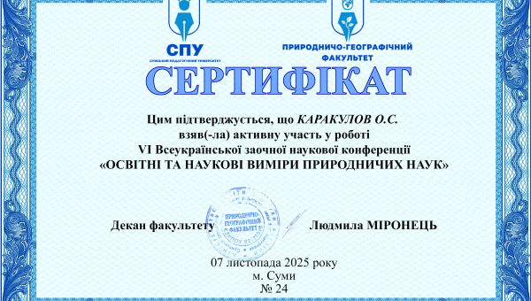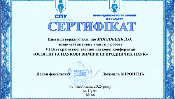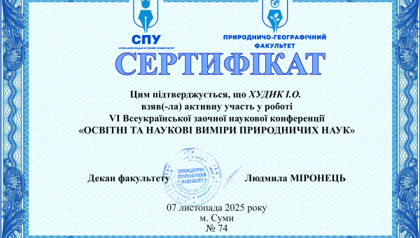 6 студентів та магістрантів спеціальностей 014 Середня освіта (Географія) і 106 (Географія) стали переможцями університетського конкурсу студентських наукових праць «Молода наука СумДПУ імені А.С. Макаренка - 2024» у номінаціях "природничі науки" та "суспільні науки". Це зокрема зобувачі освіти:
