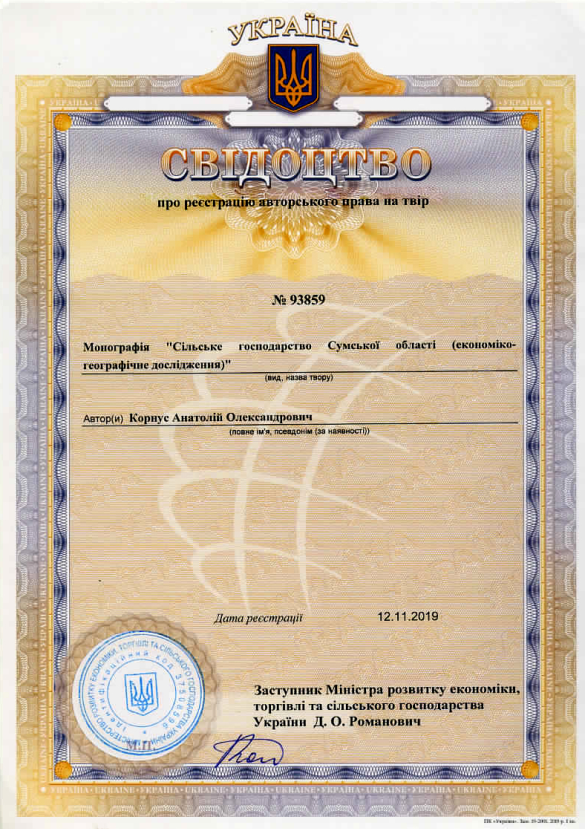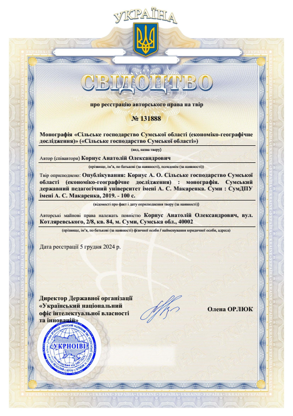 Корнус А .О. Структура рослинництва та її відповідність природним передумовам як чинник сталого розвитку агровиробництва (на прикладі Сумської області) // Фінансово-облікове забезпечення сталого розвитку аграрногосектора України: колективна монографія / за заг. ред. Л.І. Катан та Н.І. Демчук. – Дніпро: Пороги, 2017. Розділ 2, глава 2.4. – С. 163-173. | |