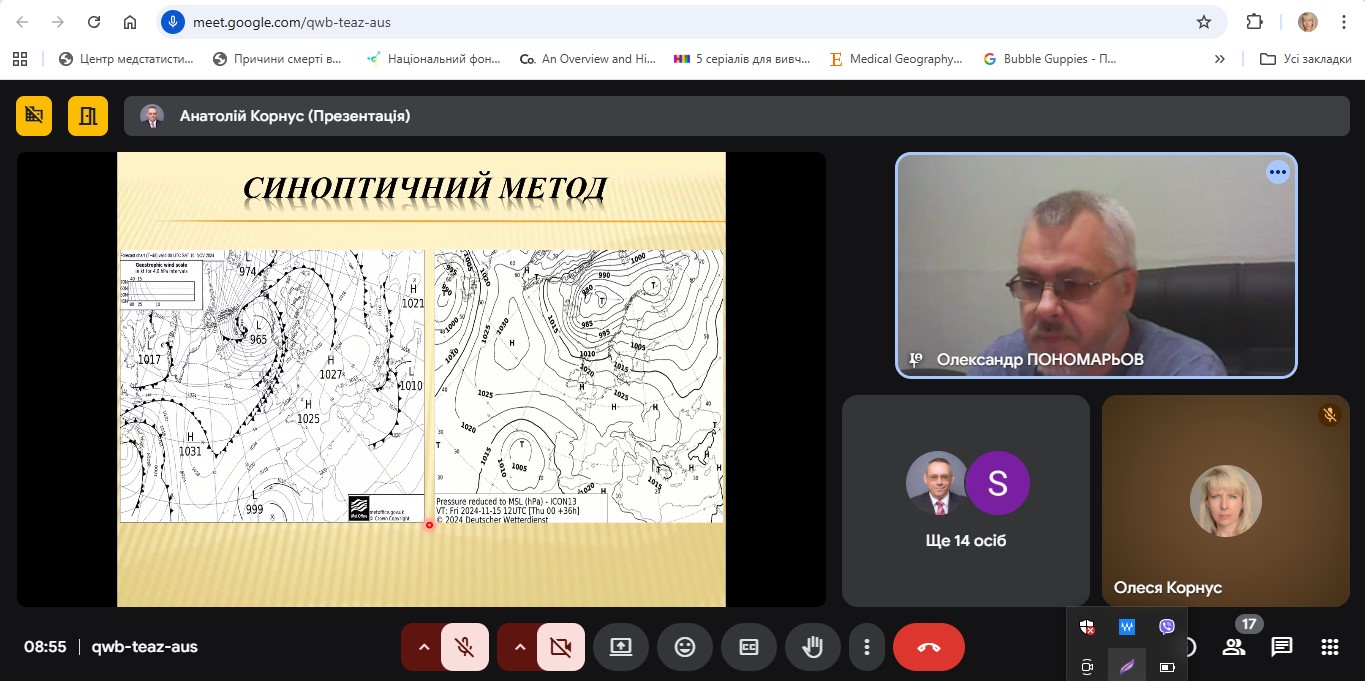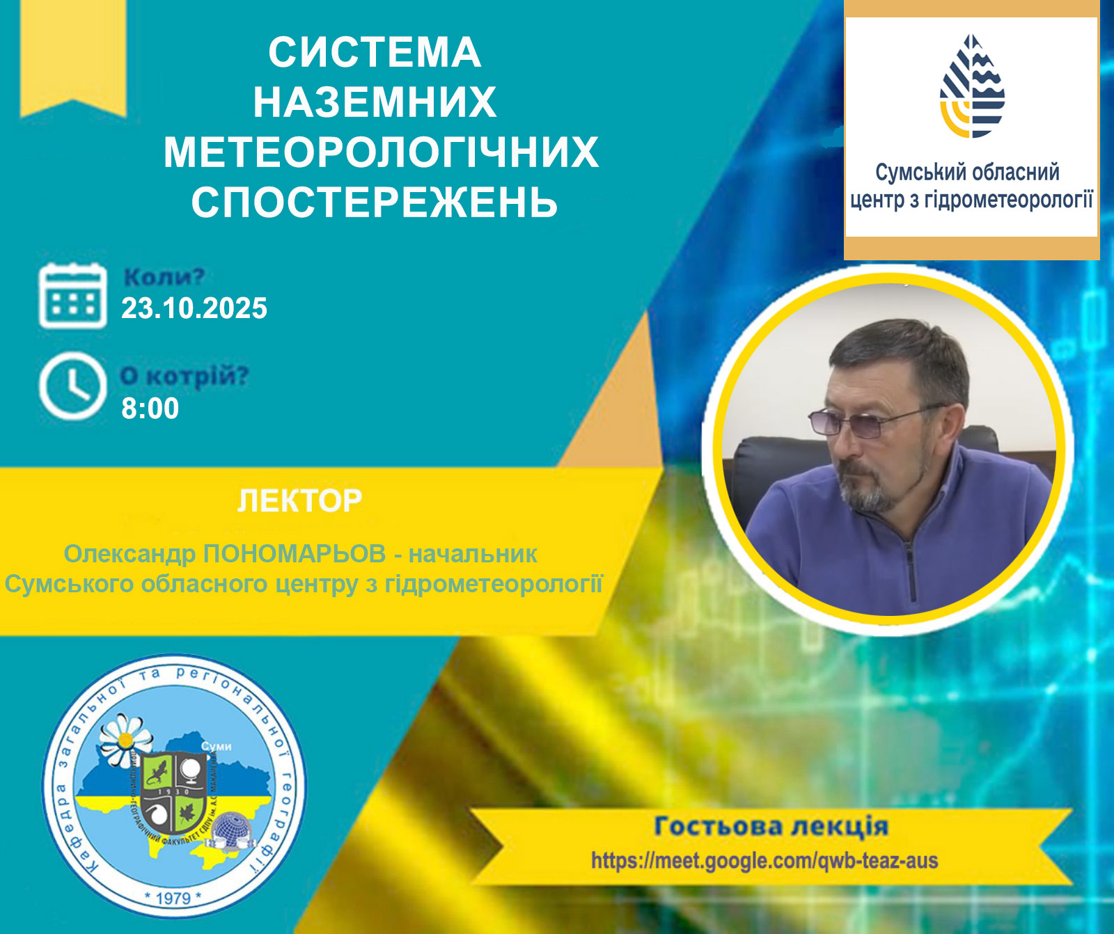 23 жовтня 2025 р., в рамках професійної підготовки студентів спеціальностей А4 «Середня освіта (Географія)» та Е4 «Науки про Землю», відбулася відкрита гостьова лекція з метеорології та кліматології (викладач - к.г.н., доц. А.О. Корнус), яку провели начальник Сумського обласного центру з гідрометеорології Олександр Пономарьов та заступник начальника центру Юрій Литвинов.