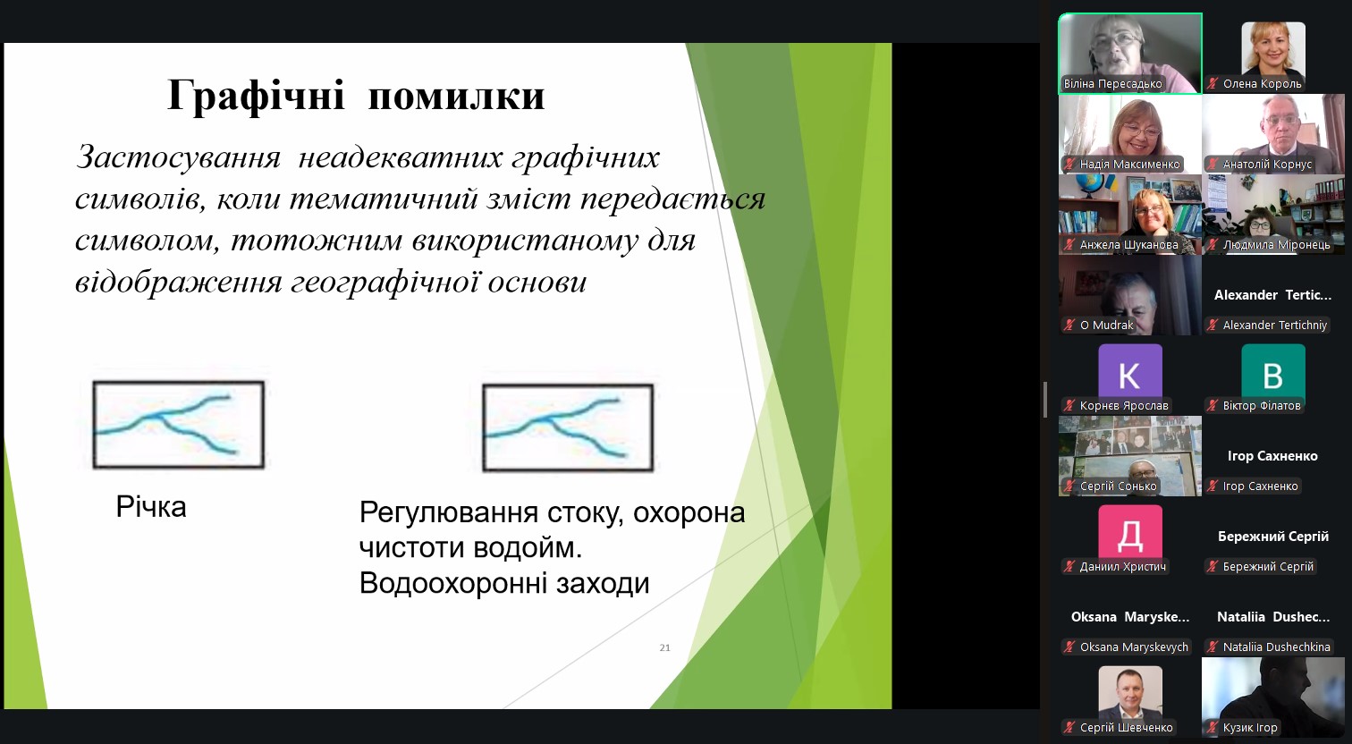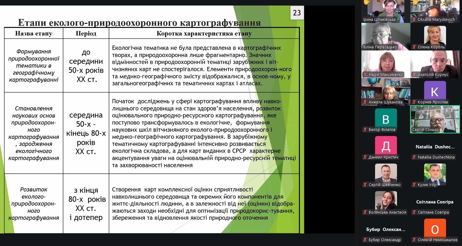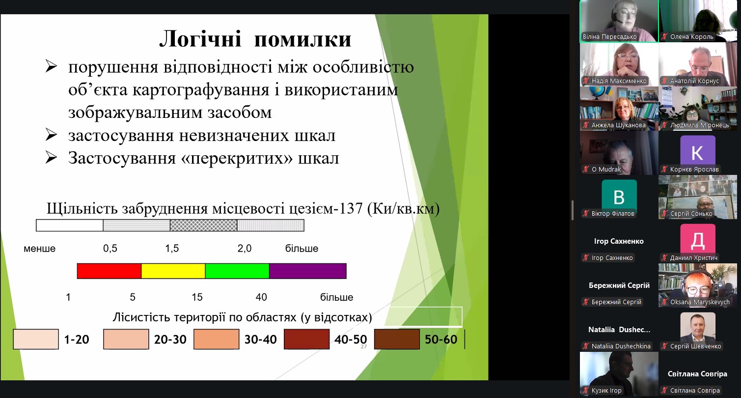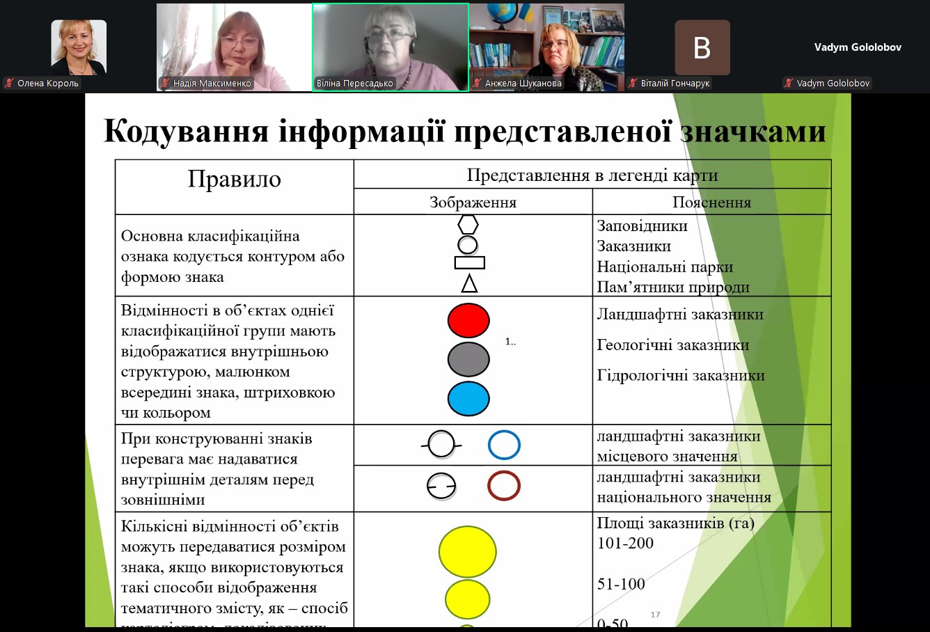 В рамках вивчення дисципліни «Теорія фізичної географії і раціональне природокористування» (викладач – к.г.н., доц. А.О. Корнус) магістранти 751 групи (спеціальність А4 «Середня освіта (Географія))» відвідали онлайн відкриту лекцію доктора географічних наук, професора Харківського національного університету імені В.Н. Каразіна Віліни Анатоліївни Пересадько на тему «Особливості картографічної візуалізації еколого-природоохоронної інформації». До лекції також долучилися магістранти спеціальності Е4 Науки про Землю та здобувачі освіти цих же спеціальностей бакалаврського рівня, які були вільні від занять.