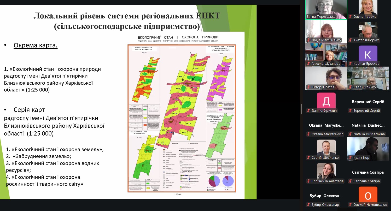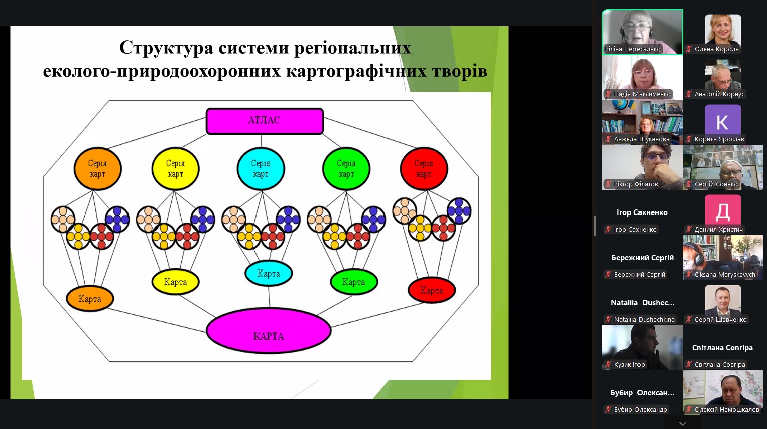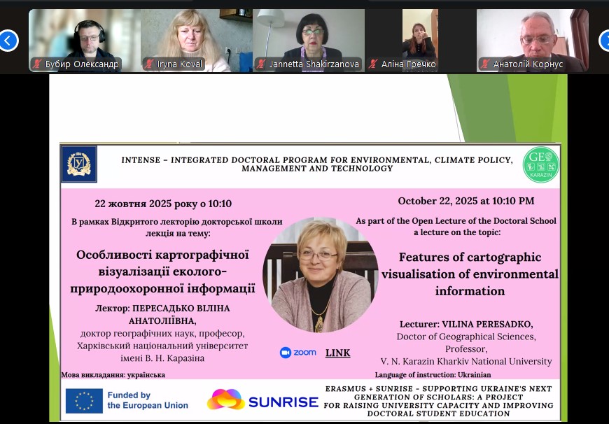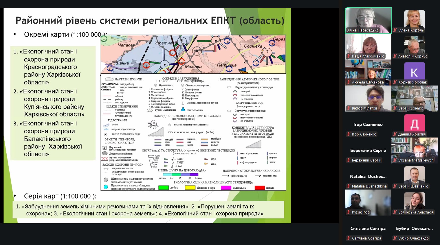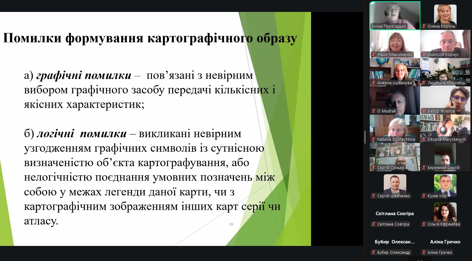 В рамках вивчення дисципліни «Теорія фізичної географії і раціональне природокористування» (викладач – к.г.н., доц. А.О. Корнус) магістранти 751 групи (спеціальність А4 «Середня освіта (Географія))» відвідали онлайн відкриту лекцію доктора географічних наук, професора Харківського національного університету імені В.Н. Каразіна Віліни Анатоліївни Пересадько на тему «Особливості картографічної візуалізації еколого-природоохоронної інформації». До лекції також долучилися магістранти спеціальності Е4 Науки про Землю та здобувачі освіти цих же спеціальностей бакалаврського рівня, які були вільні від занять.