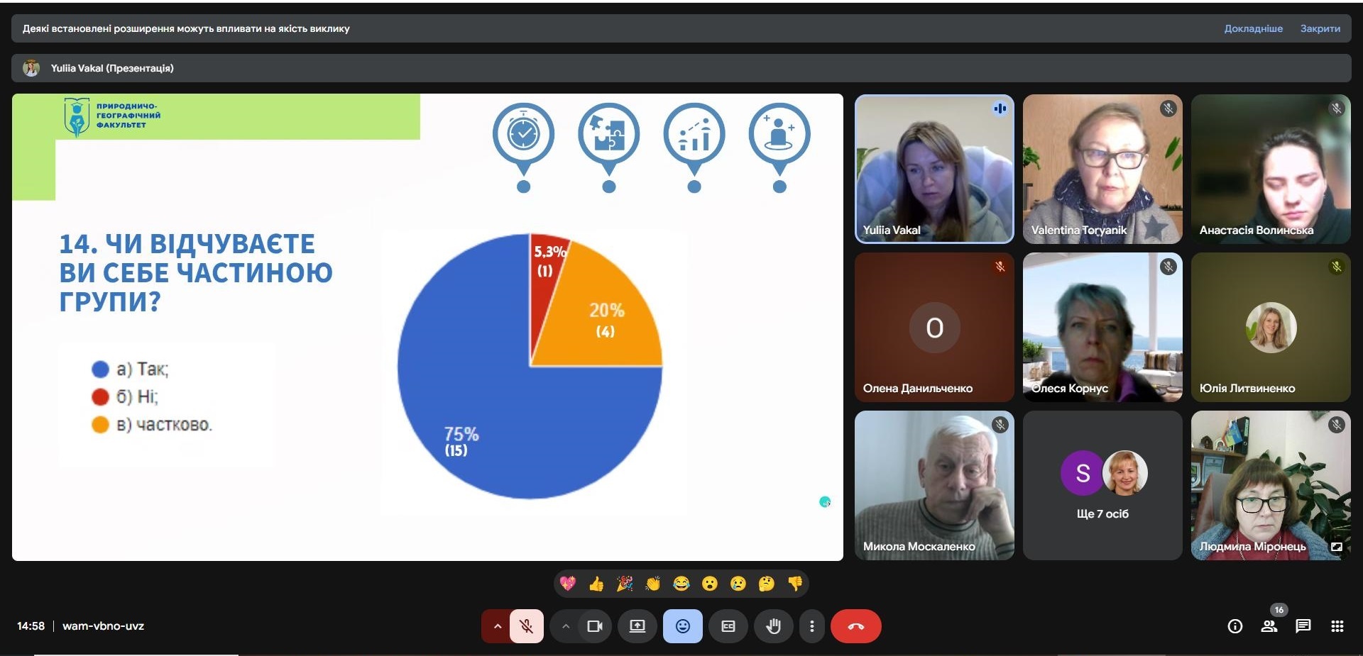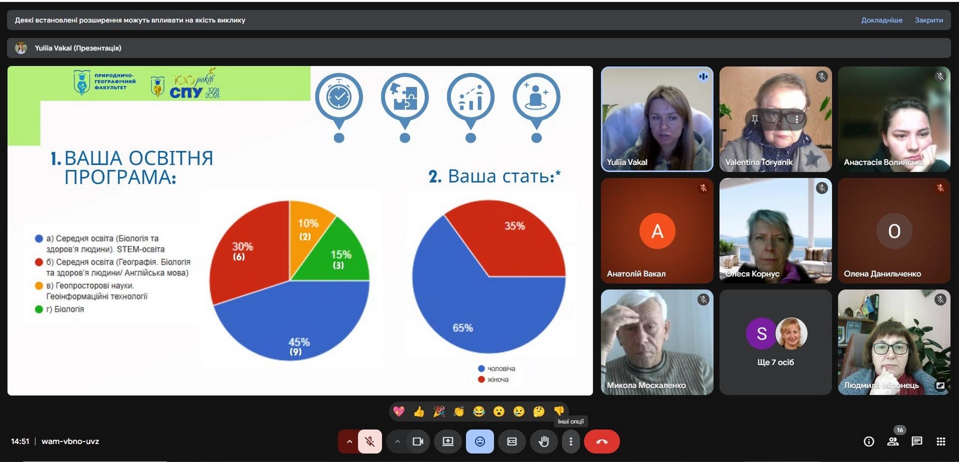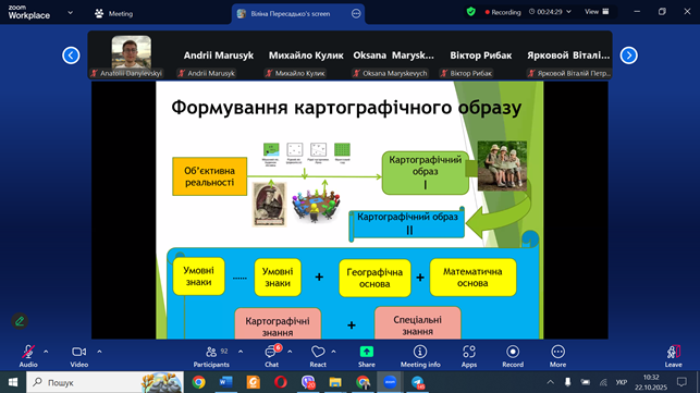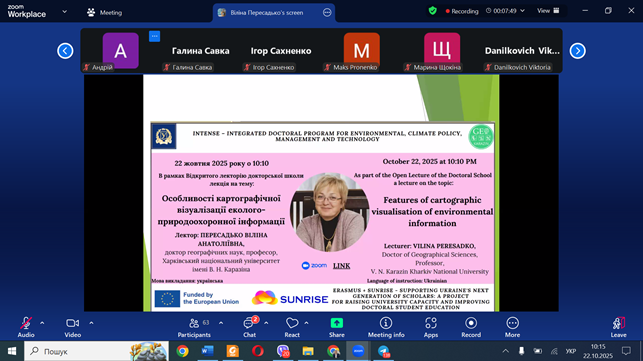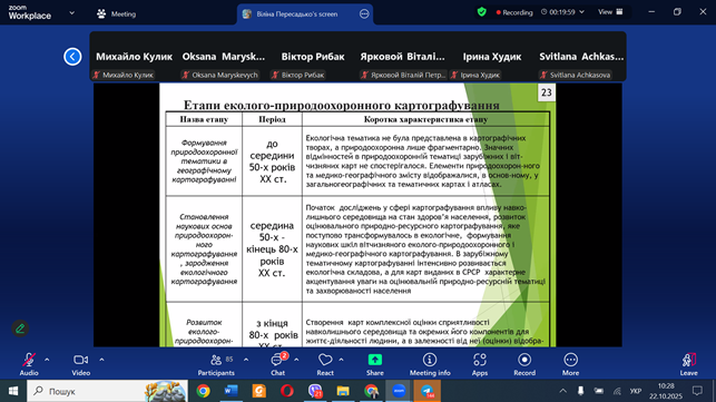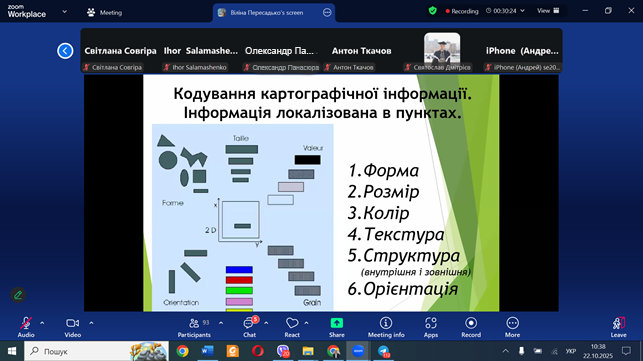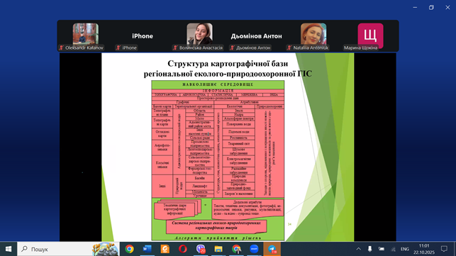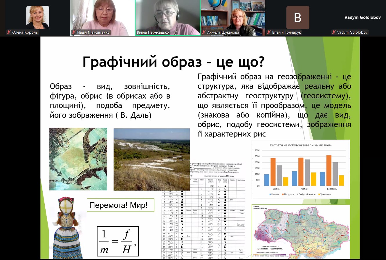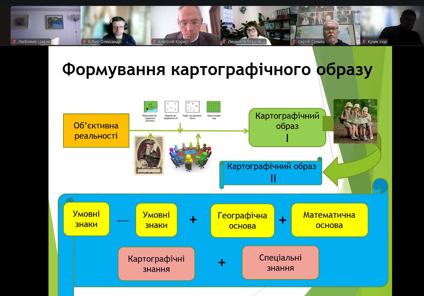 В рамках вивчення дисципліни «Теорія фізичної географії і раціональне природокористування» (викладач – к.г.н., доц. А.О. Корнус) магістранти 751 групи (спеціальність А4 «Середня освіта (Географія))» відвідали онлайн відкриту лекцію доктора географічних наук, професора Харківського національного університету імені В.Н. Каразіна Віліни Анатоліївни Пересадько на тему «Особливості картографічної візуалізації еколого-природоохоронної інформації». До лекції також долучилися магістранти спеціальності Е4 Науки про Землю та здобувачі освіти цих же спеціальностей бакалаврського рівня, які були вільні від занять.