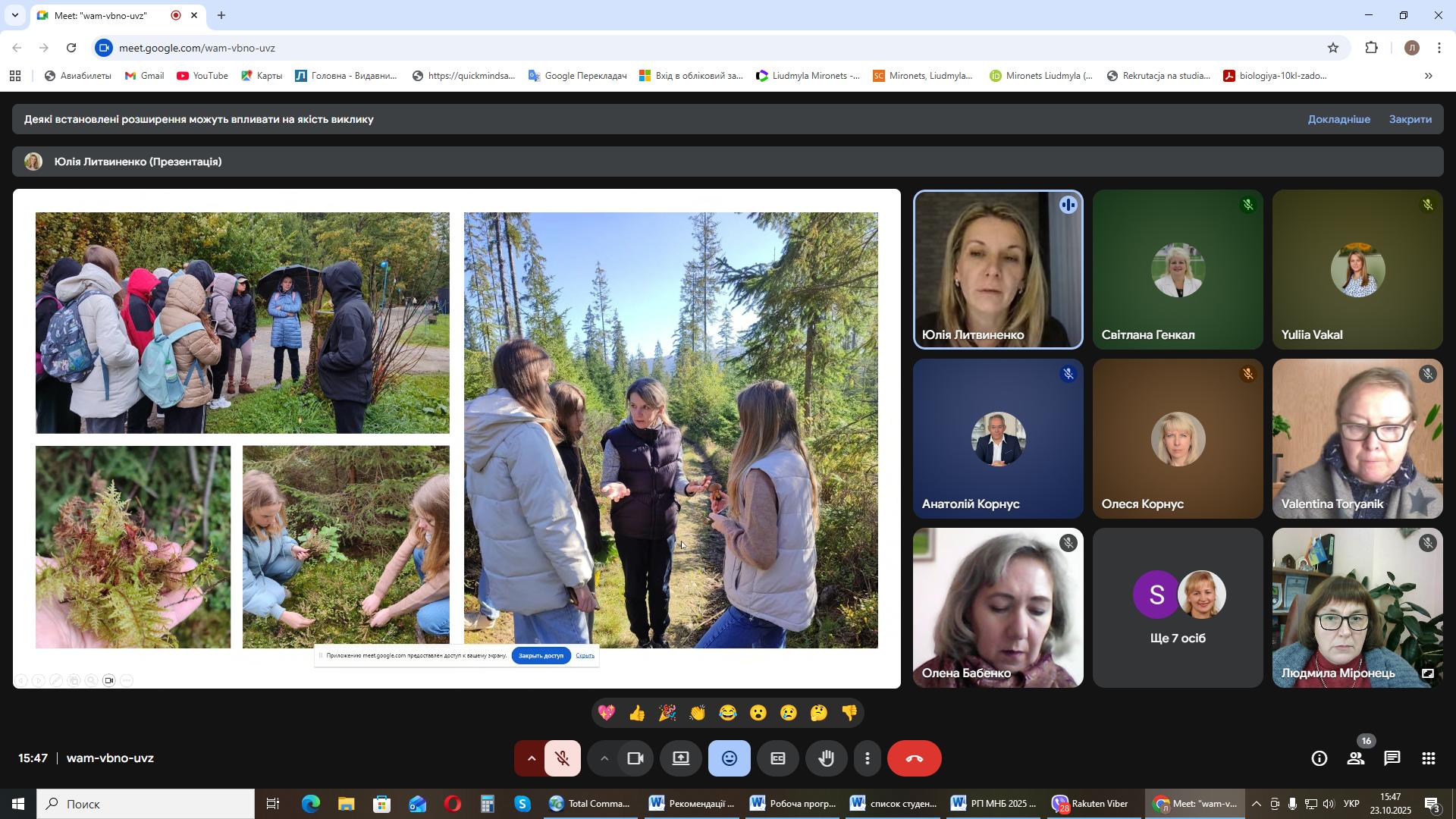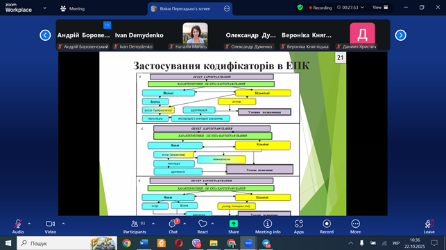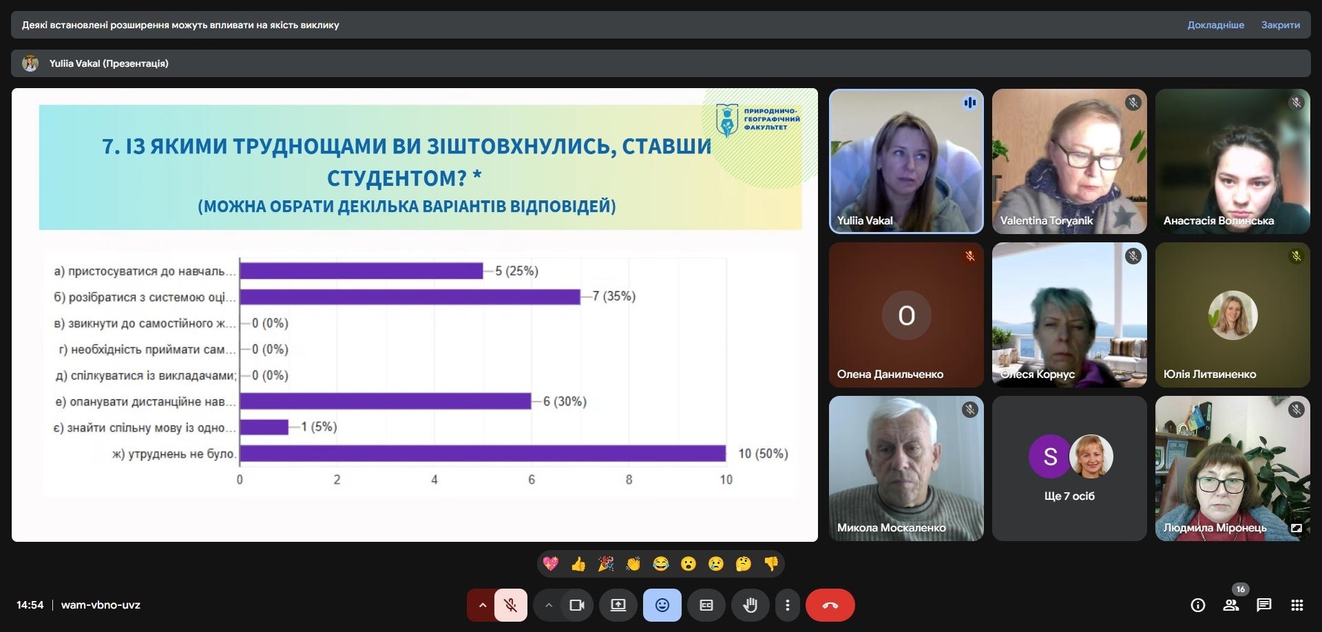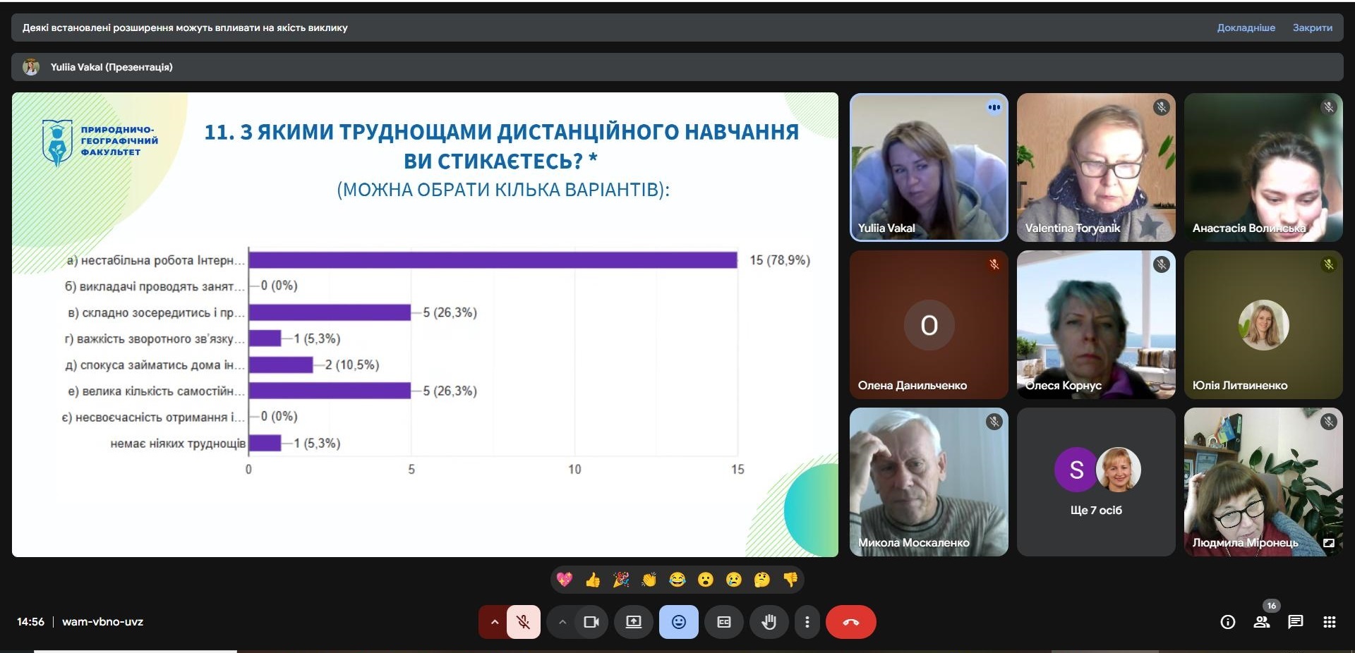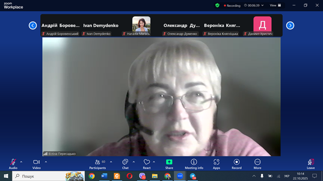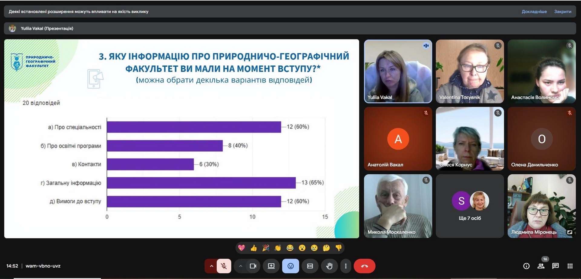 В рамках вивчення дисципліни «Теорія фізичної географії і раціональне природокористування» (викладач – к.г.н., доц. А.О. Корнус) магістранти 751 групи (спеціальність А4 «Середня освіта (Географія))» відвідали онлайн відкриту лекцію доктора географічних наук, професора Харківського національного університету імені В.Н. Каразіна Віліни Анатоліївни Пересадько на тему «Особливості картографічної візуалізації еколого-природоохоронної інформації». До лекції також долучилися магістранти спеціальності Е4 Науки про Землю та здобувачі освіти цих же спеціальностей бакалаврського рівня, які були вільні від занять.