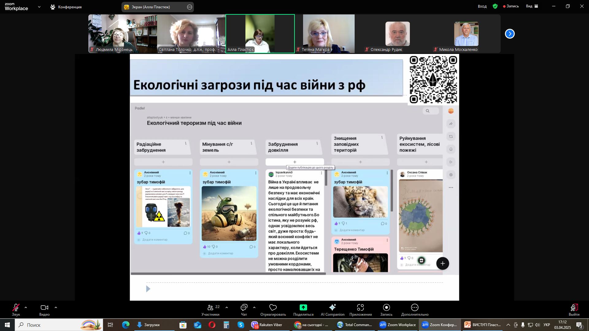 У своїй доповіді Алла Іванівна зупинилася на методичних прийомах використання народних звичаїв, традицій, прислів’їв, приказок, висловлювань українських вчених, письменників на уроках біології. Особливу увагу звернула на внесок українських учених у розвиток світової біологічної науки. Також Алла Іванівна поділилася власним досвідом багаторічної роботи з організації проектної діяльності екологічного спрямування та виховання любові до Батьківщини, рідного краю і відповідального ставлення до ресурсів. За допомогою кьюар – кодів усі присутні могли переглянути напрацювання учасників освітнього процесу на інтерактивній дошці Padlet, які стосуються вивчення та збереження первоцвітів Сумської області, екологічних загроз під час війни та інше.