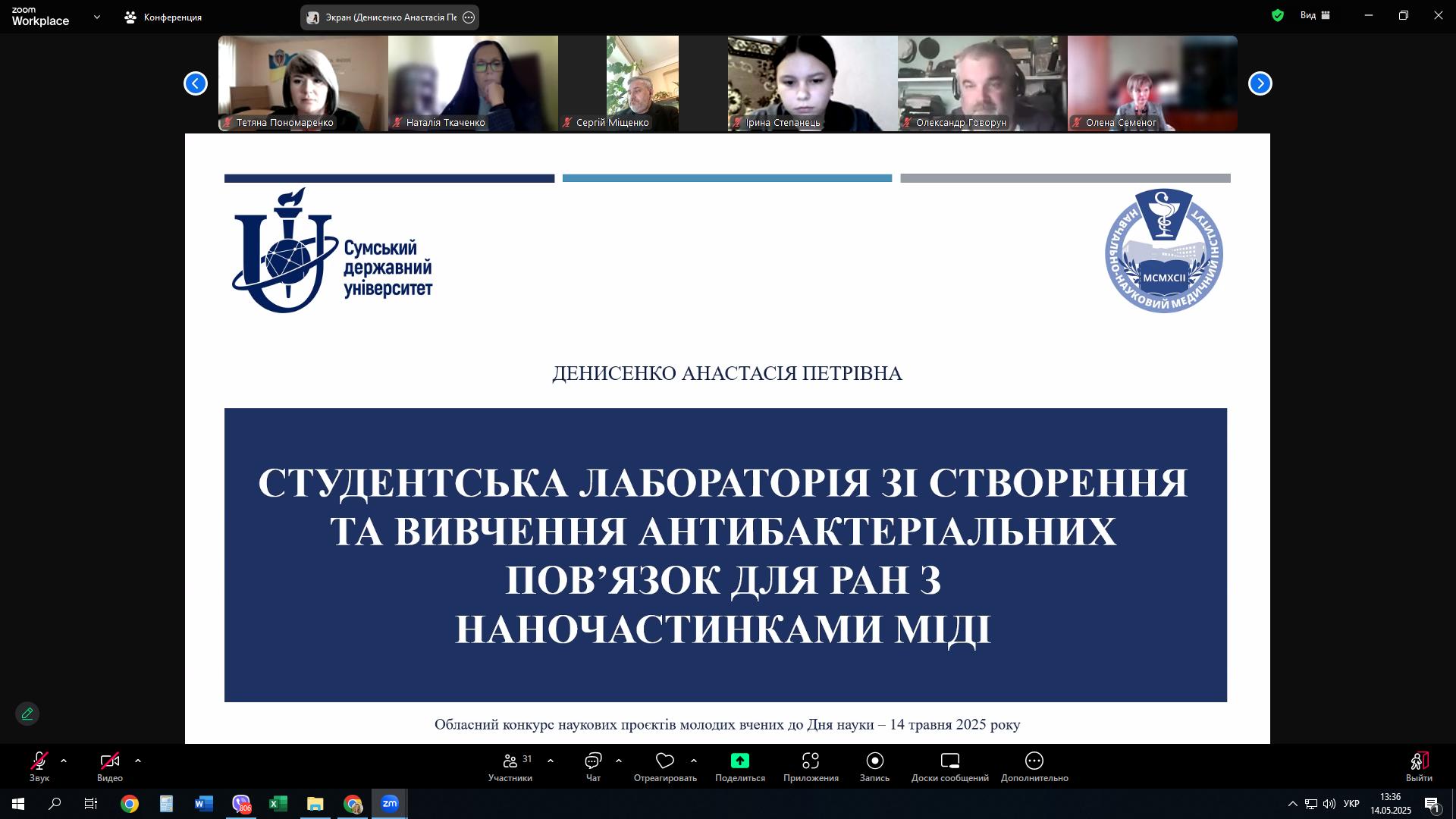 Степанець Ірина, здобувачка вищої освіти за освітнім рівнем Магістр спеціальності 091 «Біологія та біохімія», взяла участь у щорічному обласному конкурсі наукових проєктів молодих вчених, організованому Департаментом освіти і науки Сумської обласної державної адміністрації з нагоди Дня науки.