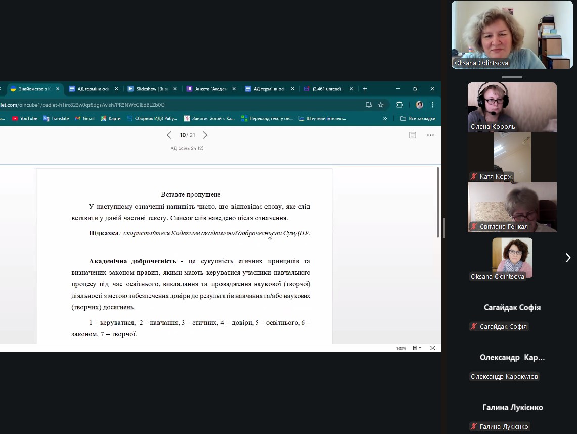 Метою заходу стало ознайомлення студентів 1 курсу ОР Бакалавр та 1 курсу ОР Магістр з Кодексом академічної доброчесності та принципами, викладеними в Декларації про академічну доброчесність СумДПУ.