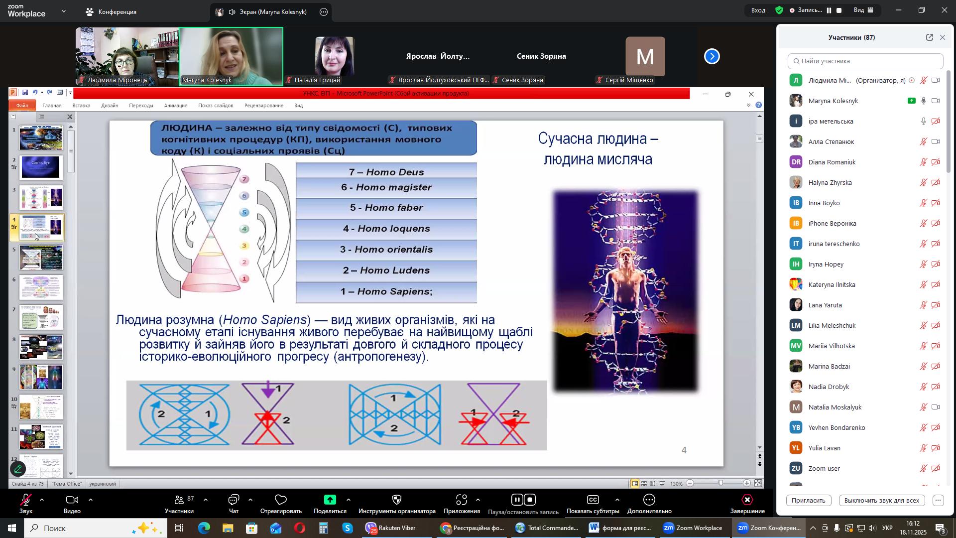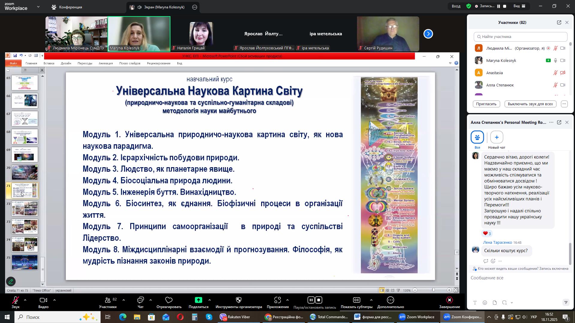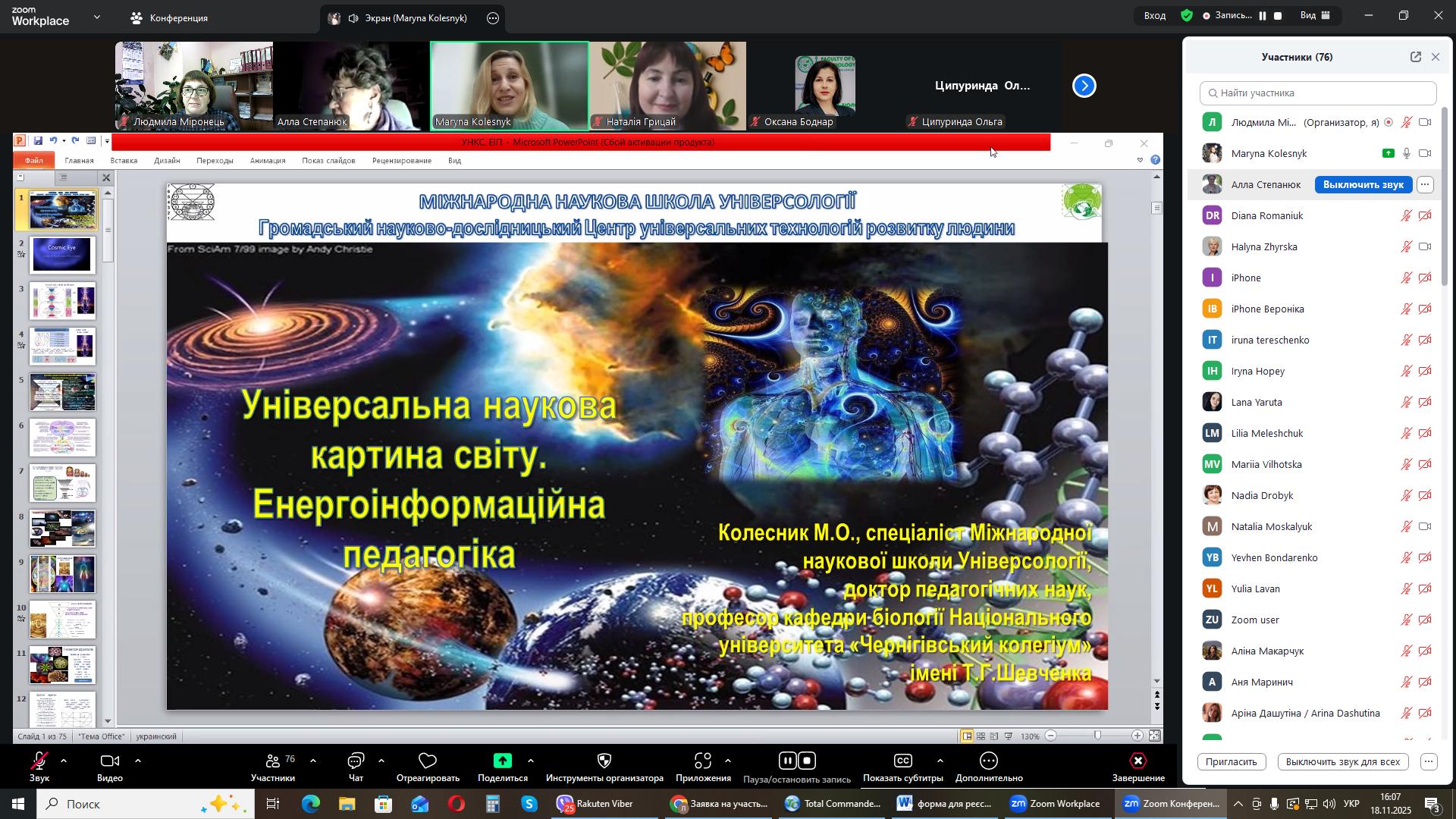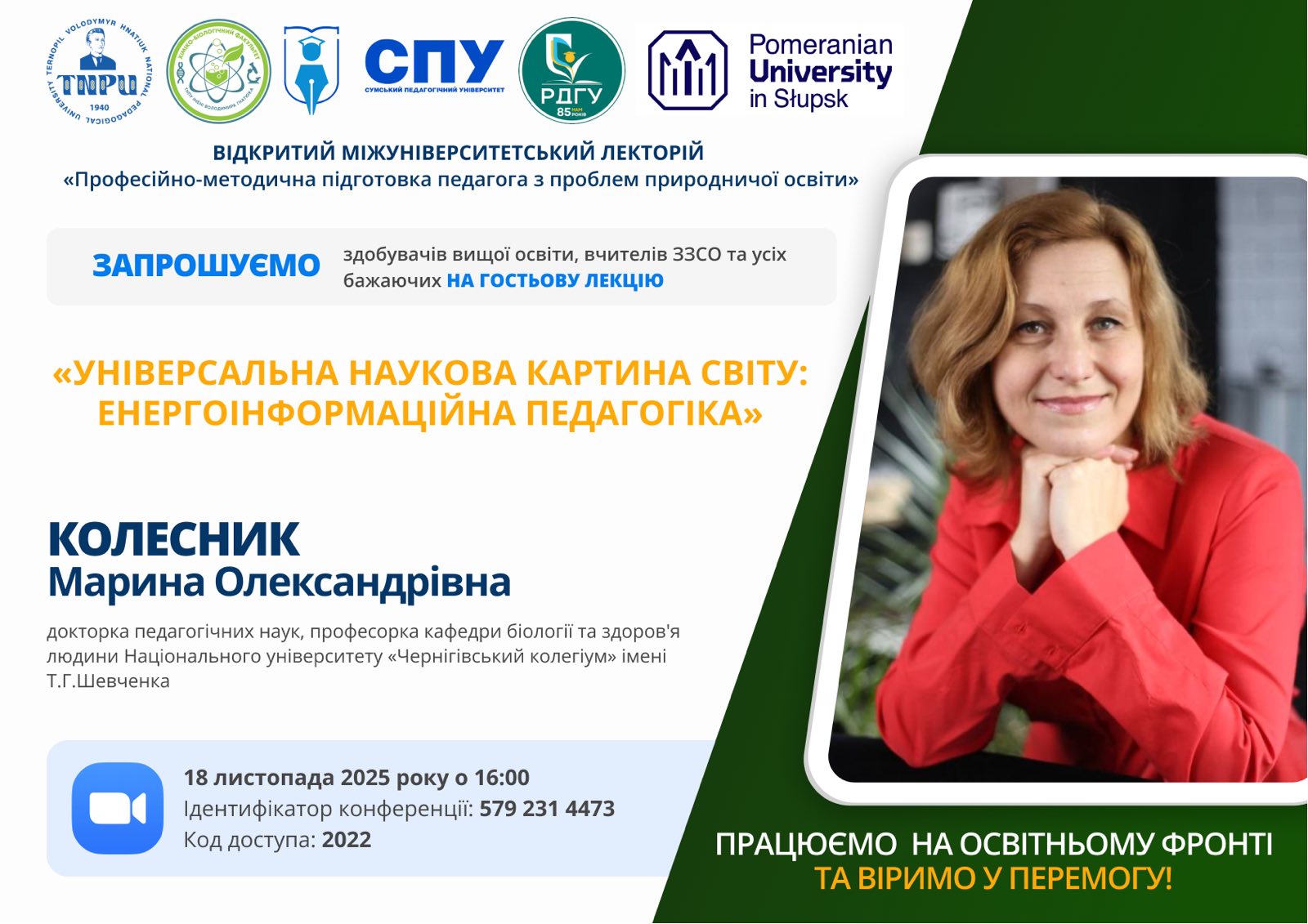 На черговому засіданні міжнародного міжуніверситетського лекторію, 18 листопада 2025 року гостьову лекцію на тему: «Універсальна наукова картина світу: енергоінформаційна педагогіка» прочитала Марина Олександрівна Колесник, докторка педагогічних наук, професорка кафедри біології та здоров'я людини Національного університету «Чернігівський колегіум імені Т.Г. Шевченка».