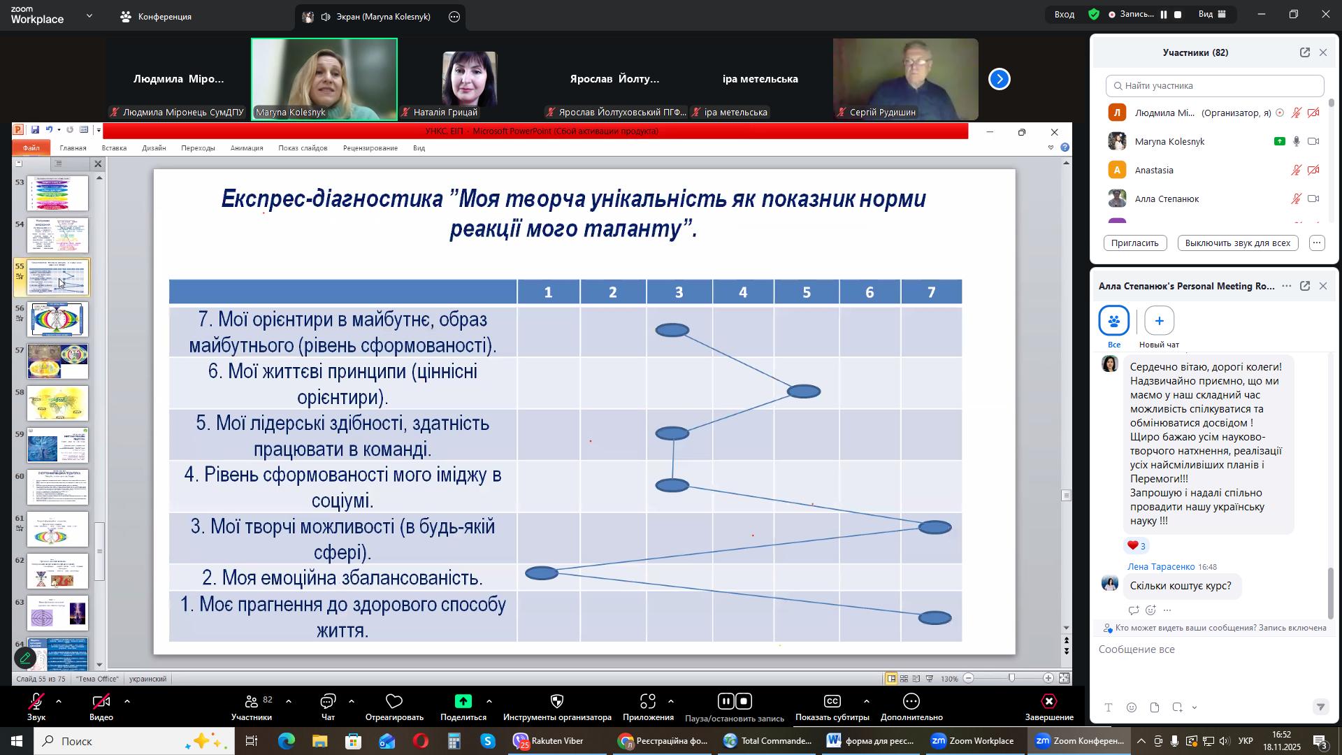 Пані Марина розповіла про наукову картину світу, інтеграцію, міжпредметні зв'язки, світогляд, ієрархічність життя, симетрію і асиметрію, енергоінформаційну педагогіку та багато інших питань, які цікавлять усіх тих, які вивчають природничі науки.