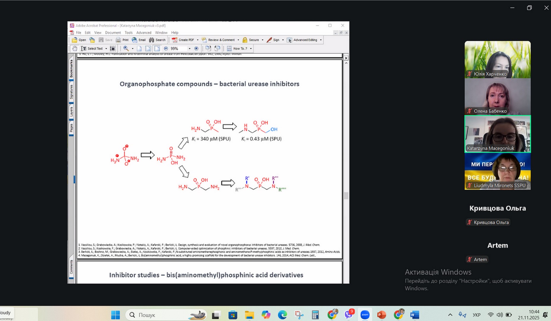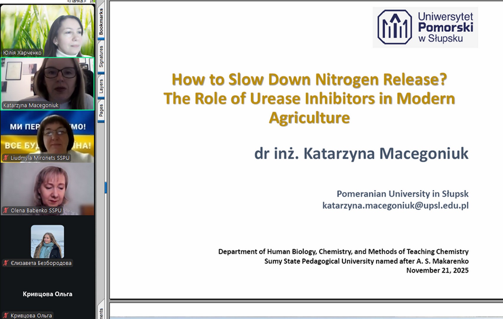 21 листопада 2025 року кафедрою біології людини, хімії та методики навчання хімії було організовано гостьову лекцію від доктора філософії (технічні науки), старшого спеціаліста в Науковому відділі Поморського університету в Слупську, Польща, Катаржини Мацегонюк. Гостьова лекція була проведена для здобувачів освіти спеціальностей 014 / А4 Середня освіта (Хімія) в рамках вивчення навчальних дисциплін «Хімічна технологія і сталий розвиток» (бакалаврський рівень), «Вибрані розділи сучасної хімії», «Аналітична хімія довкілля» (магістерський рівень). До лекції також доєднались здобувачі освіти третього (освітньо-наукового) рівня в рамках вивчення дисципліни «Функціональна біохімія».