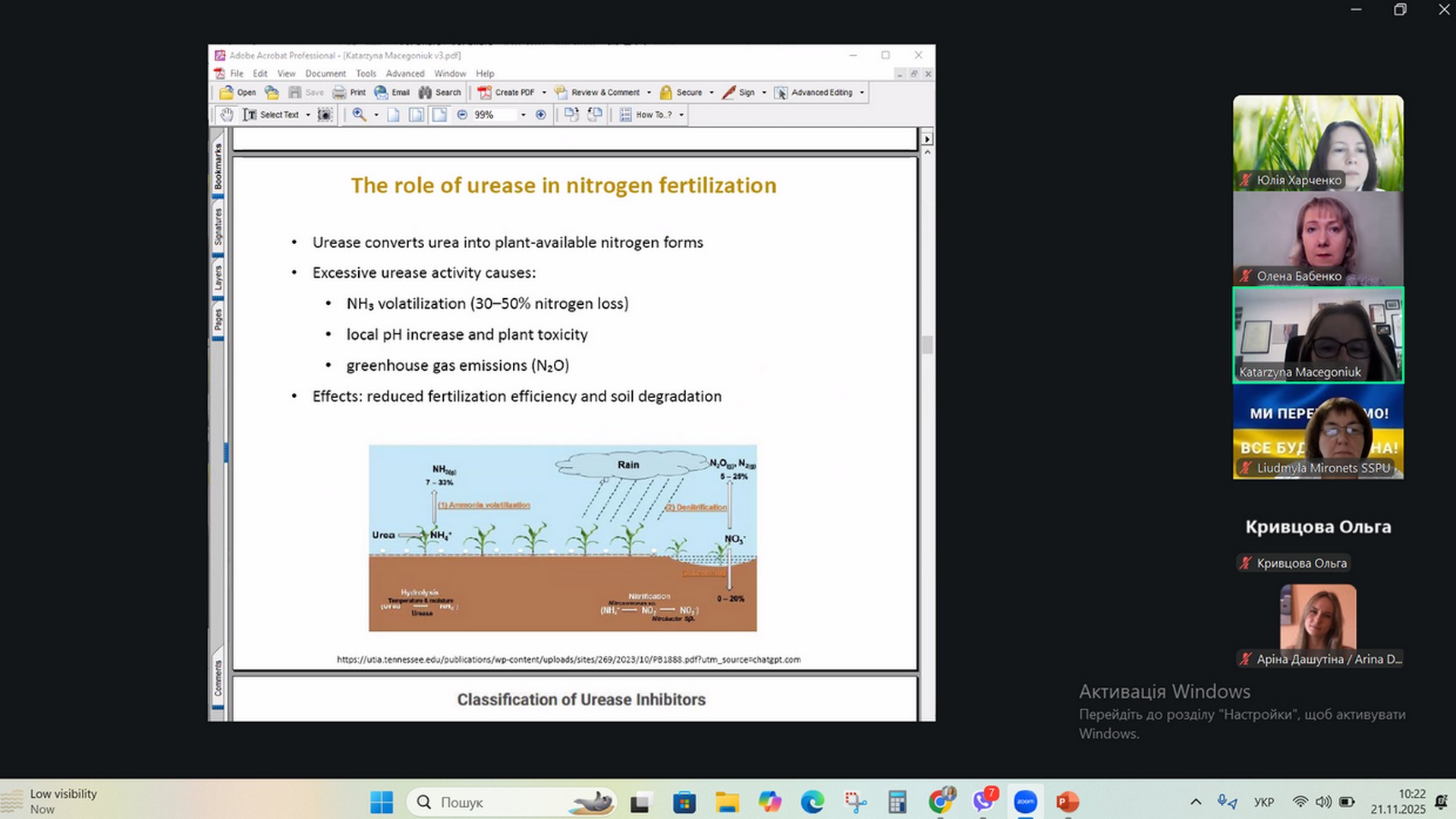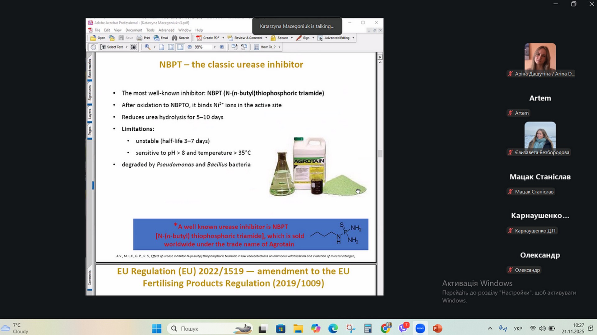 Гостьова лекція доктора Катаржини Мацегонюк на тему ролі інгібіторів уреази (« How to Slow Down Nitrogen Release? The Role of Urease Inhibitors in Modern Agriculture») стала глибоким оглядом інноваційних рішень у сільському господарстві. Лекторка висвітлила питання підвищення ефективності азотних добрив та важливості переходу до сталих агротехнологій. Вона розкрила проблему значних втрат азоту, які виникають через надмірну активність ферменту уреази, що призводить до випаровування 30–50% азоту у вигляді амоніаку та спричиняє деградацію ґрунту. Доктор Мацегонюк акцентувала увагу на тому, що інгібування уреази є ключовим підходом для мінімізації цього екологічного та економічного збитку.