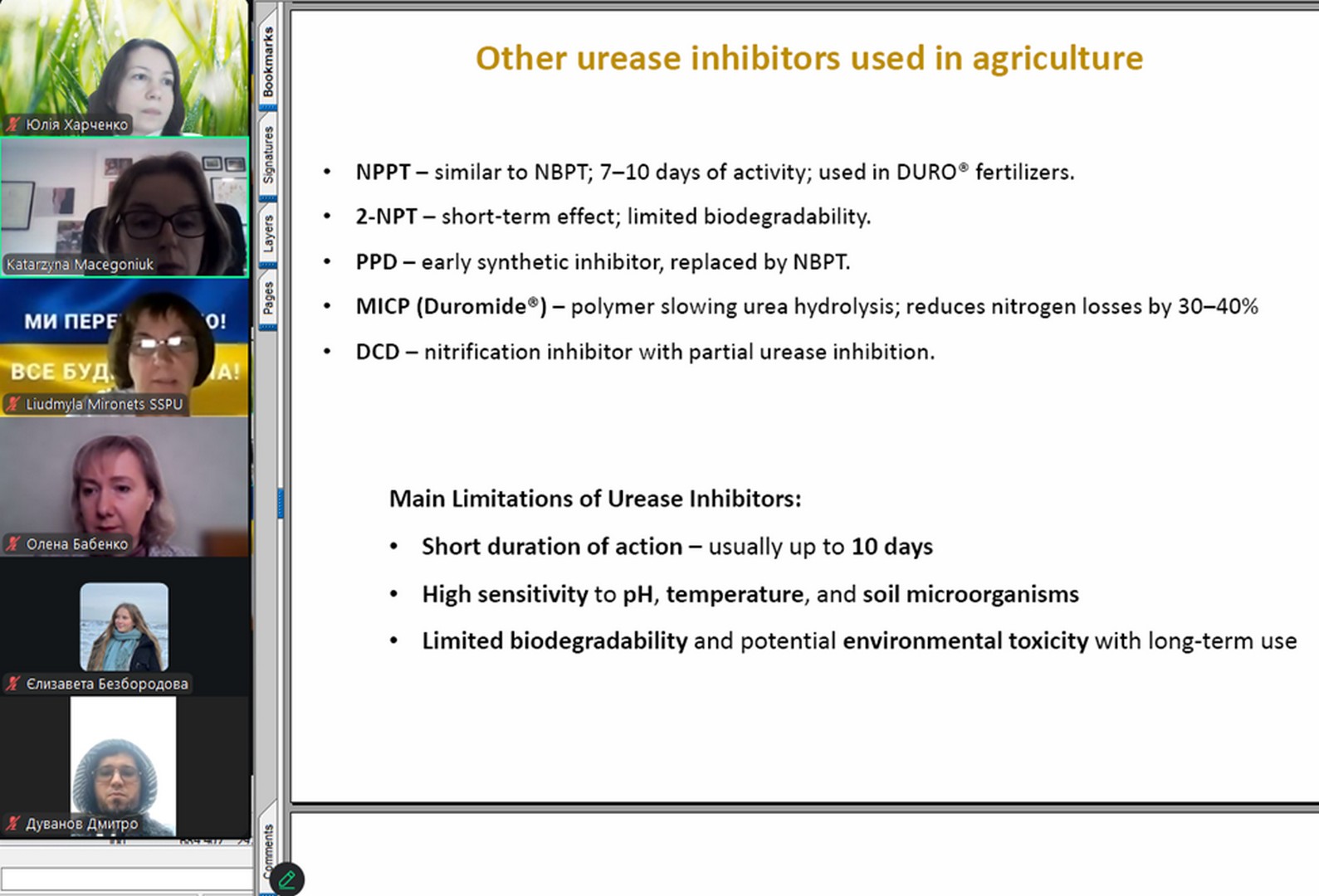 Було відзначено, що поширений інгібітор NBPT має суттєві обмеження через його нестабільність, чутливість до високих температур і pH, а також складнощі з промисловим застосуванням. Тому лекторка представила нові напрямки досліджень, зосереджені на розробці довговічних та біорозкладних сполук. Окрема увага була приділена використанню інгібіторів у формі протруйників насіння, що забезпечує локалізовану дію в ризосфері, дозволяючи використовувати менші дози. На лекції було продемонстровано, що природні екстракти з часнику та гвоздики, які містять аліцин і евгенол, відповідно, можуть виступати як подвійні агенти – інгібітори уреази та антимікробні захисники. Насамкінець, було підсумовано, що контроль цього ферменту є вирішальним для підвищення ефективності добрив і майбутнього сучасного екологічного землеробства.