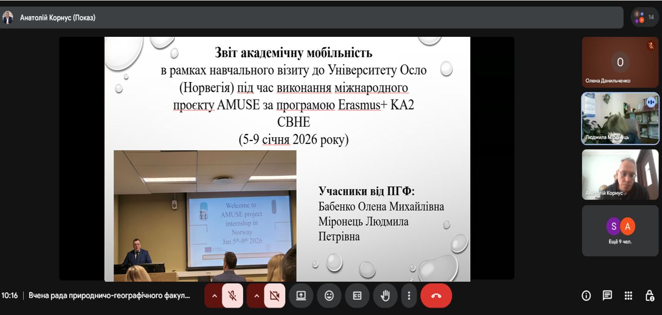 На засіданні вченої ради природничо-географічного факультету, яке відбулося 22 січня 2026 року, Людмила Петрівна та Олена Михайлівна поділилися досвідом участі у такому візиті із колегами.