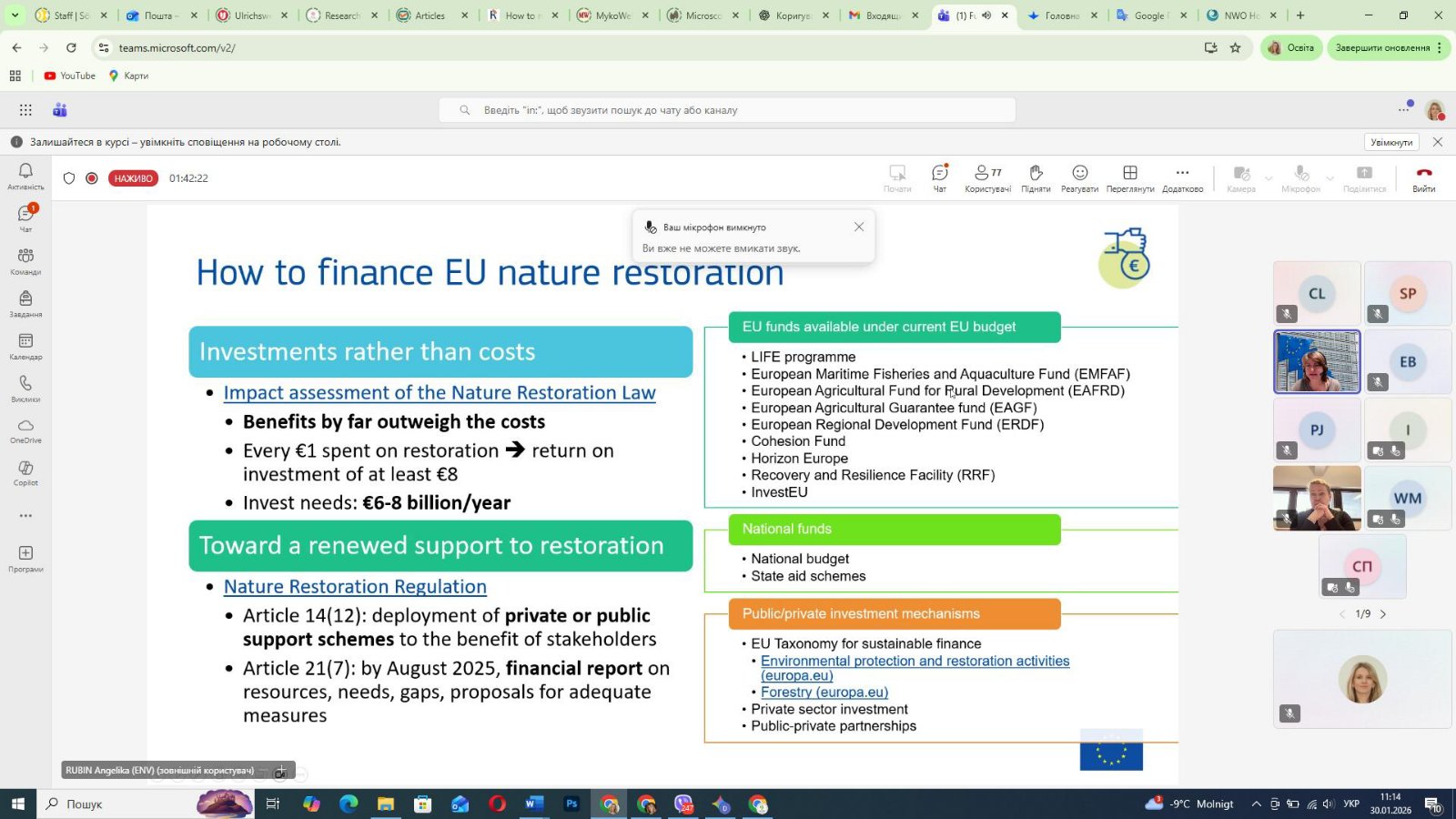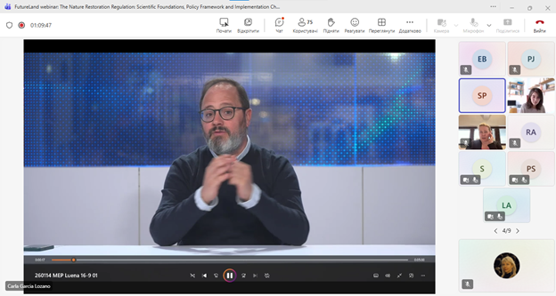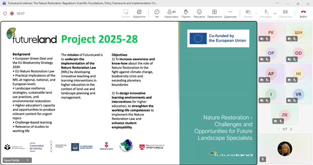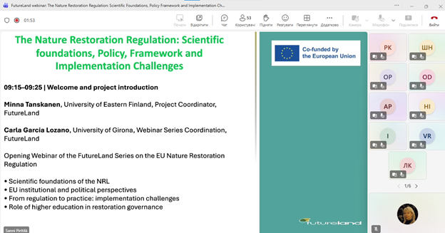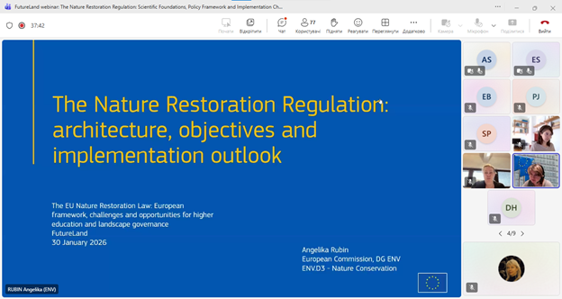 30 січня 2026 року НПП природничо-географічного факультету: А.О. Корнус (заст. декана ПГФ), Ю.І. Литвиненко (зав. кафедри біології та МНБ) і О.Г. Корнус (зав. кафедри загальної та регіональної географії) взяли участь у міжнародному вебінарі “The Nature Restoration Regulation: Scientific Foundations, Policy Framework and Implementation Challenges”, присвяченому обговоренню нового Регламенту Європейського Союзу щодо відновлення природи. Захід став першим у серії вебінарів, які проводяться в межах міжнародного проєкту «Nature Restoration – challenges and opportunities for future landscape specialists» (FutureLand), що реалізується за програмою Erasmus+ Cooperation Partnerships for Higher Education (KA220-HED). Координатором української частини проєкту є кафедра соціально-економічної географії і регіонознавства імені Костянтина Нємця Харківського національного університету імені В. Н. Каразіна.