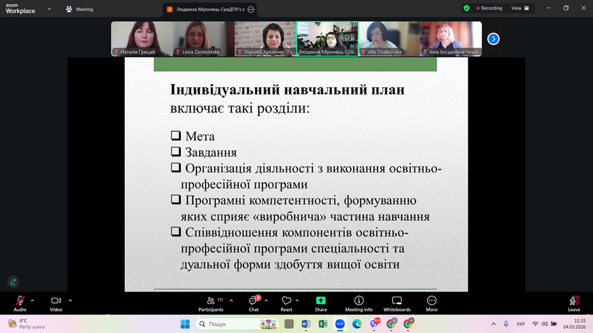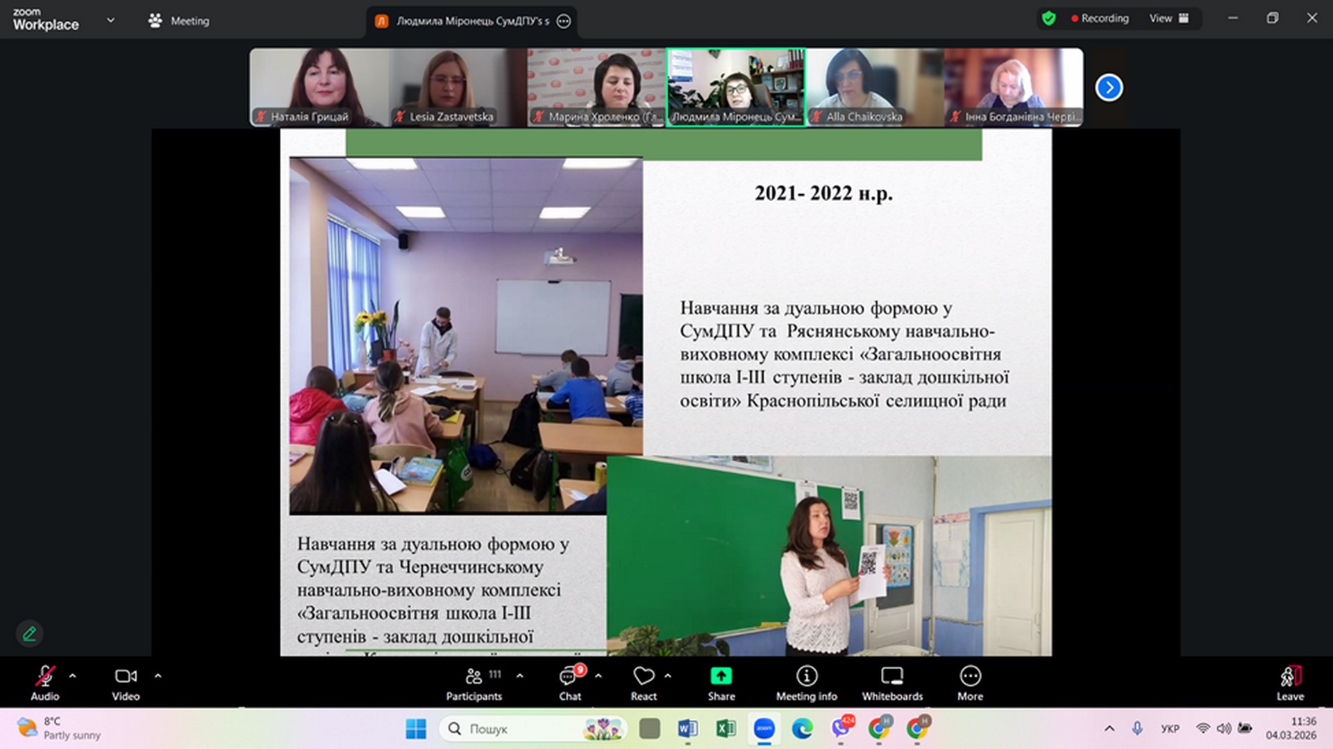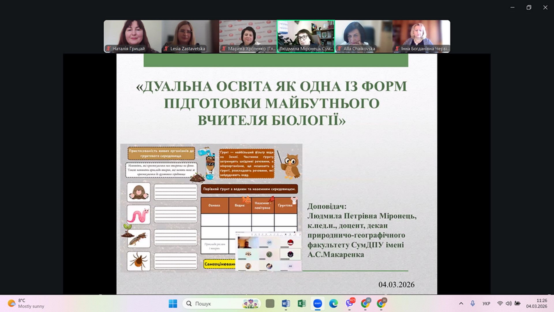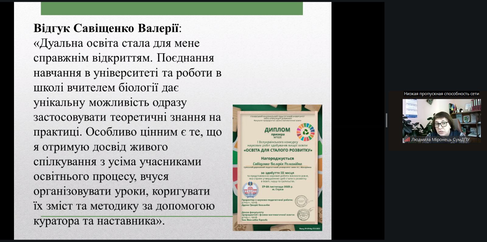 Людмила МІРОНЕЦЬ, кандидат педагогічних наук, доцент, декан природничо-географічного факультету Сумського державного педагогічного університету імені А.С. Макаренка виступила із доповіддю на тему: «ДУАЛЬНА ОСВІТА ЯК ОДНА ІЗ ФОРМ ПІДГОТОВКИ МАЙБУТНЬОГО ВЧИТЕЛЯ БІОЛОГІЇ». Під час доповіді Людмила Петрівна зазначила, що СумДПУ імені А.С. Макаренка не входив до пілотного проєкту МОН України з даної тематики, але має досвід впровадження дуальної форми здобуття освіти на природничо-географічному факультеті ще з 2021- 2022 н.р. За цей період на факультеті за такою формою було організовано навчання для 16 здобувачів. Навчання здійснюється за моделлю поділеного дня та передбачає здобуття на робочому місці від 33 % до 47% кредитів освітньої програми. Людмила Петрівна поділилася алгоритмом переведення здобувачів освіти на дуальну форму здобуття вищої освіти, який затверджено у СумДПУ імені А.С. Макаренка. Одним із позитивних кейсів є приклад здобувачки вищої освіти другого рівня вищої освіти за спеціальністю А4 Середня освіта (Біологія та здоров’я людини) галузі знань А Освіта Валерії САВІЩЕНКО, яка під час навчання в університеті та роботи на посаді вчителя біології у Сумському закладі загальної середньої освіти І – ІІІ ступенів № 26 Сумської міської ради, під керівництвом куратора від університету Людмили МІРОНЕЦЬ підготувала наукову роботу на Всеукраїнський конкурс наукових робіт здобувачів вищої освіти «Освіта для сталого розвитку», де зайняла ІІІ місце. У відгуку Валерія зазначила наступне: «Дуальна освіта стала для мене справжнім відкриттям. Поєднання навчання в університеті та роботи в школі вчителем біології дає унікальну можливість одразу застосовувати теоретичні знання на практиці. Особливо цінним є те, що я отримую досвід живого спілкування з усіма учасниками освітнього процесу, вчуся організовувати уроки, коригувати їх зміст та методику за допомогою куратора та наставника».