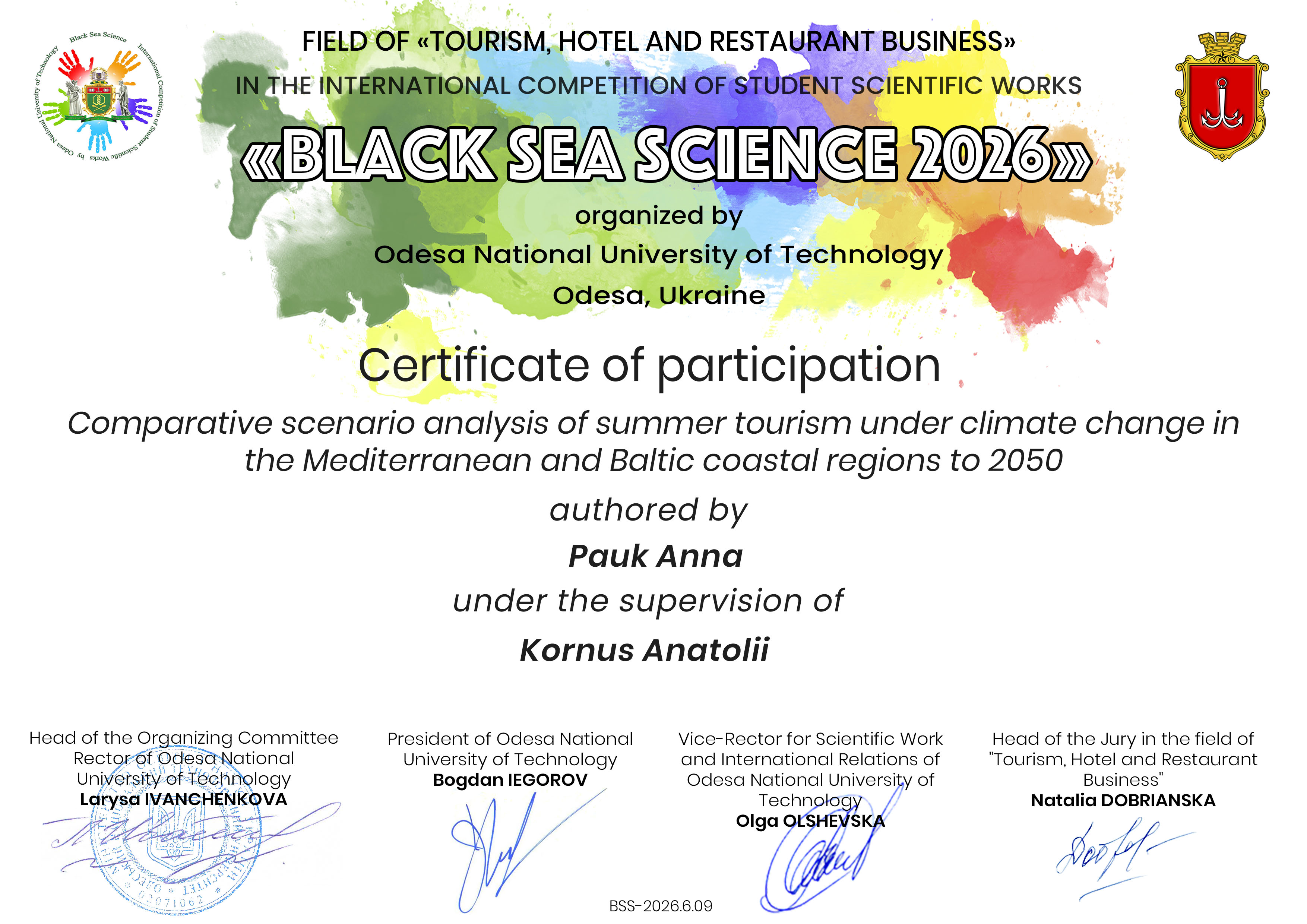 - Паук А.В. (753 група) «Comparative scenario analysis of summer tourism under climate change in the Mediterranean and Baltic coastal regions to 2050» (наук. керівник к.г.н., доц. А.О. Корнус)