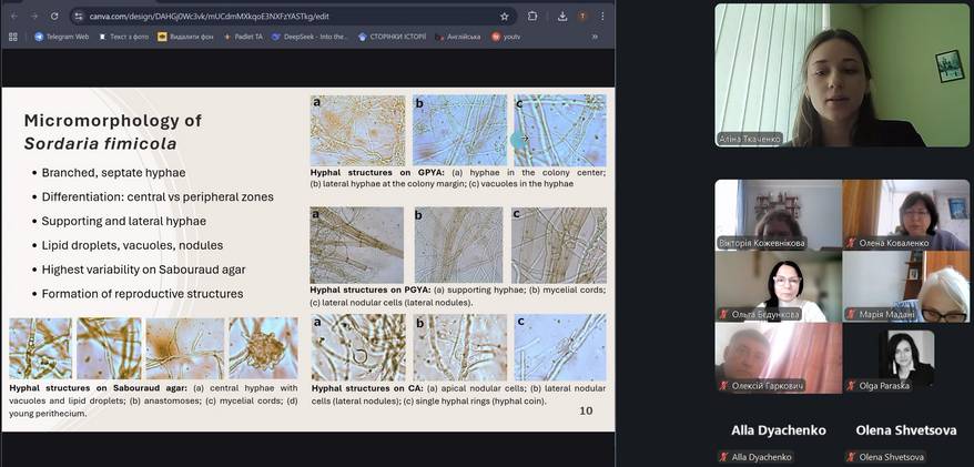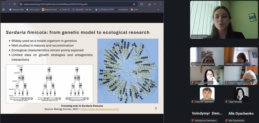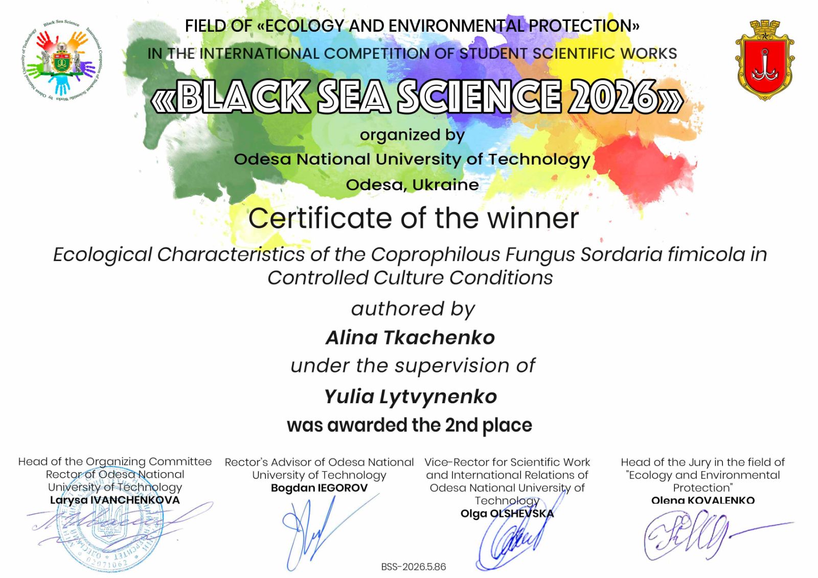 Ткаченко А. (642 група) «Ecological Characteristics of the Coprophilous Fungus Sordaria fimicola in Controlled Culture Conditions» – диплом ІІ ступеня (науковий керівник – к. б. н., доц. Ю.І. Литвиненко) (Секція «Екологія та охорона навколишнього середовища»).