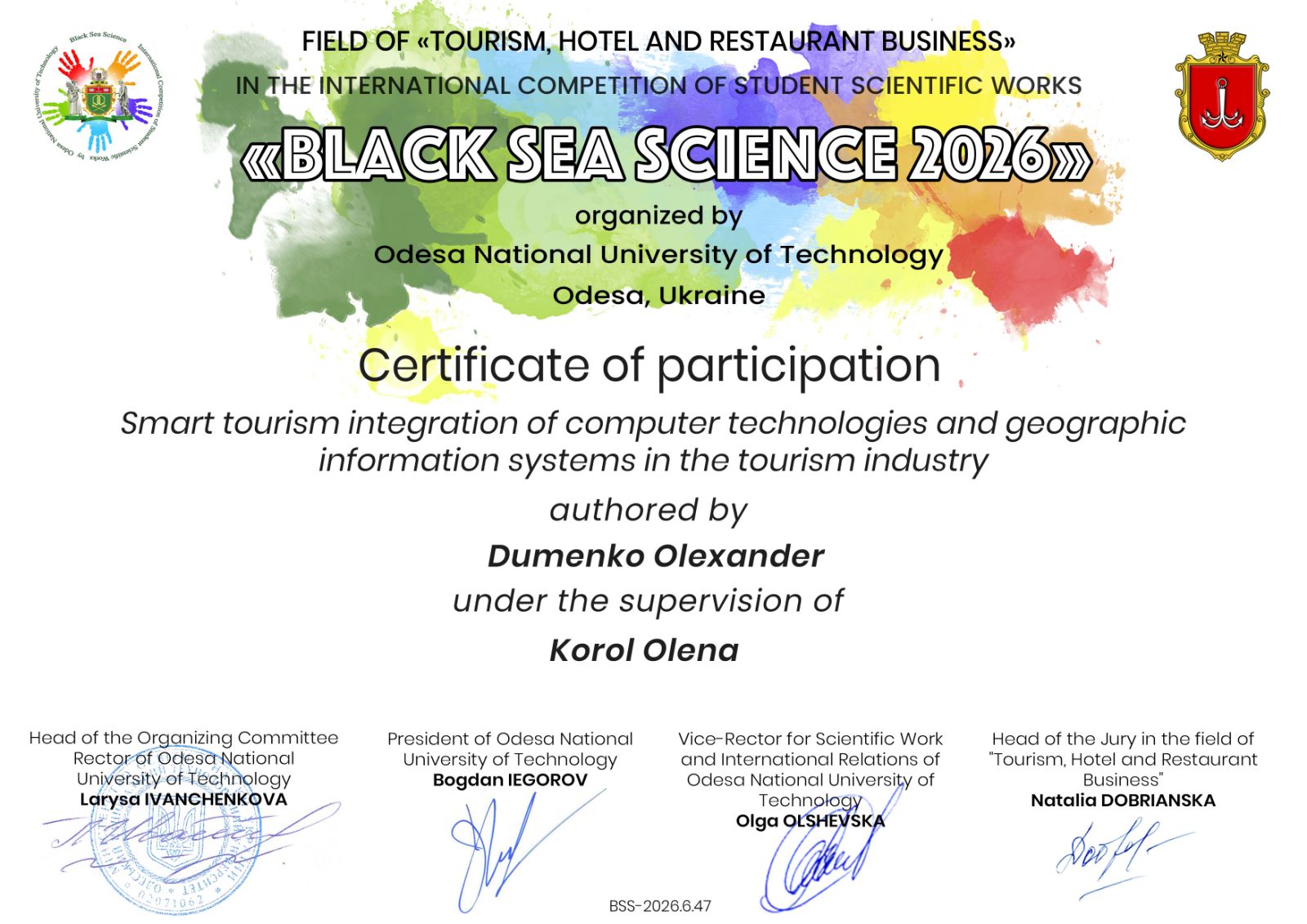 - Думенко О. (722 група) «Smart tourism integration of computer technologies and geographic information systems in the tourism industry» (наук. керівник к.п.н., доц. О.М. Король)