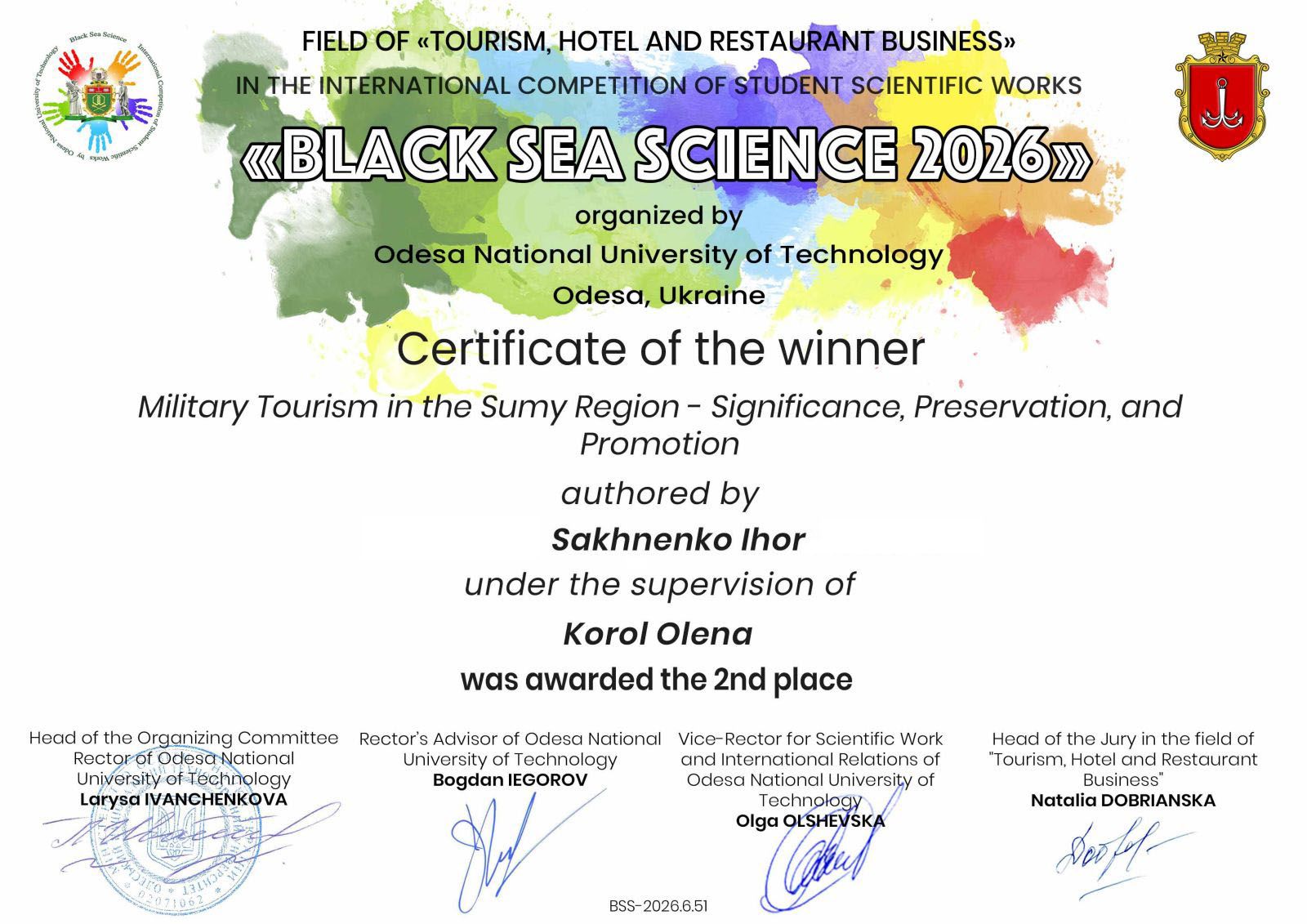 Сахненко І.М. (722 група) «Military Tourism in the Sumy Region – Significance, Preservation, and Promotion» – диплом ІІ ступеня (науковий керівник – к. п. н., доц. О.M. Король) (Секція «Туризм та готельно-ресторанна справа»).