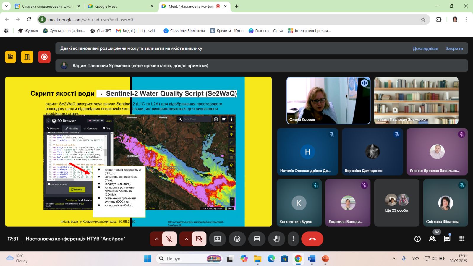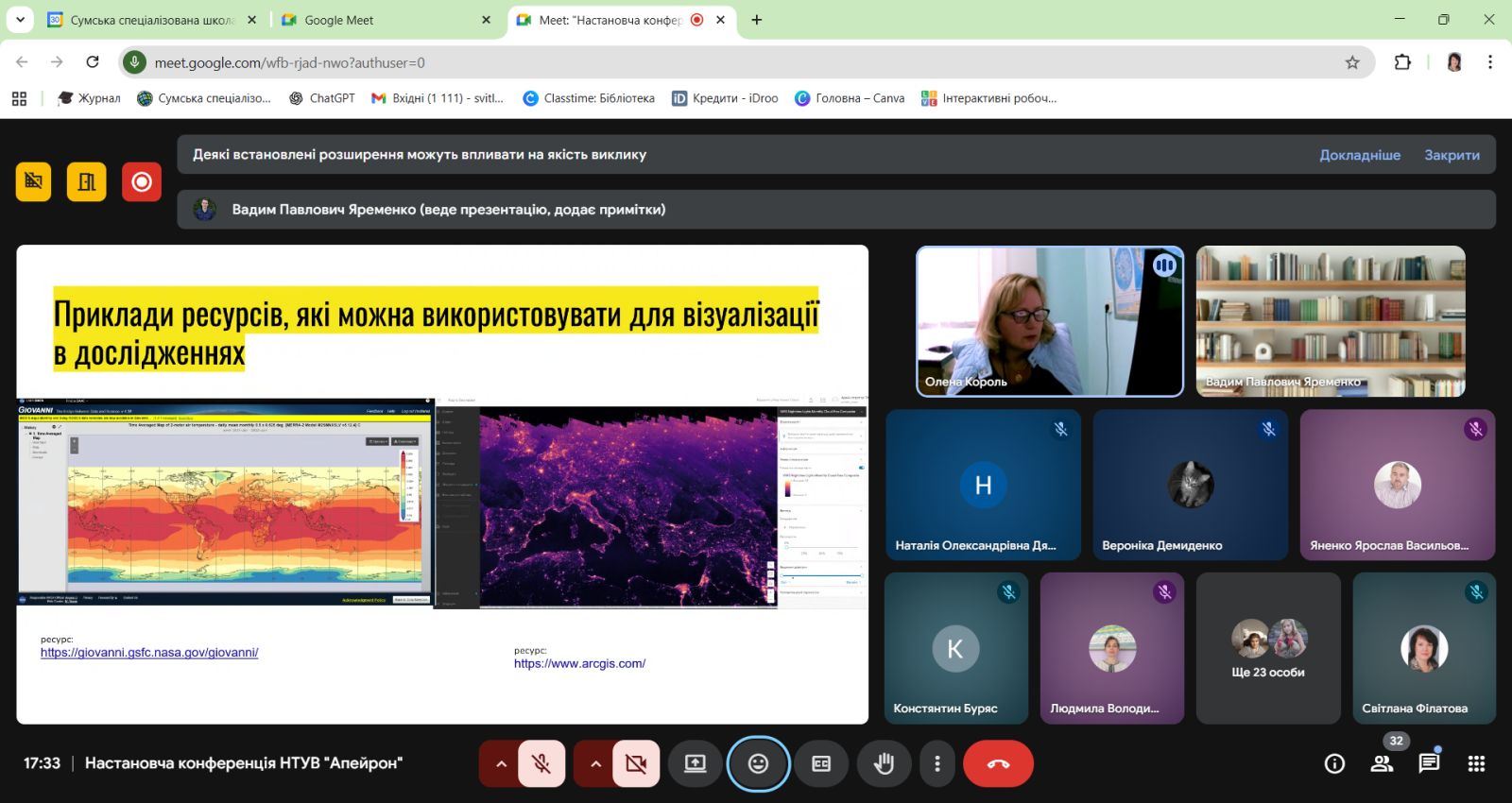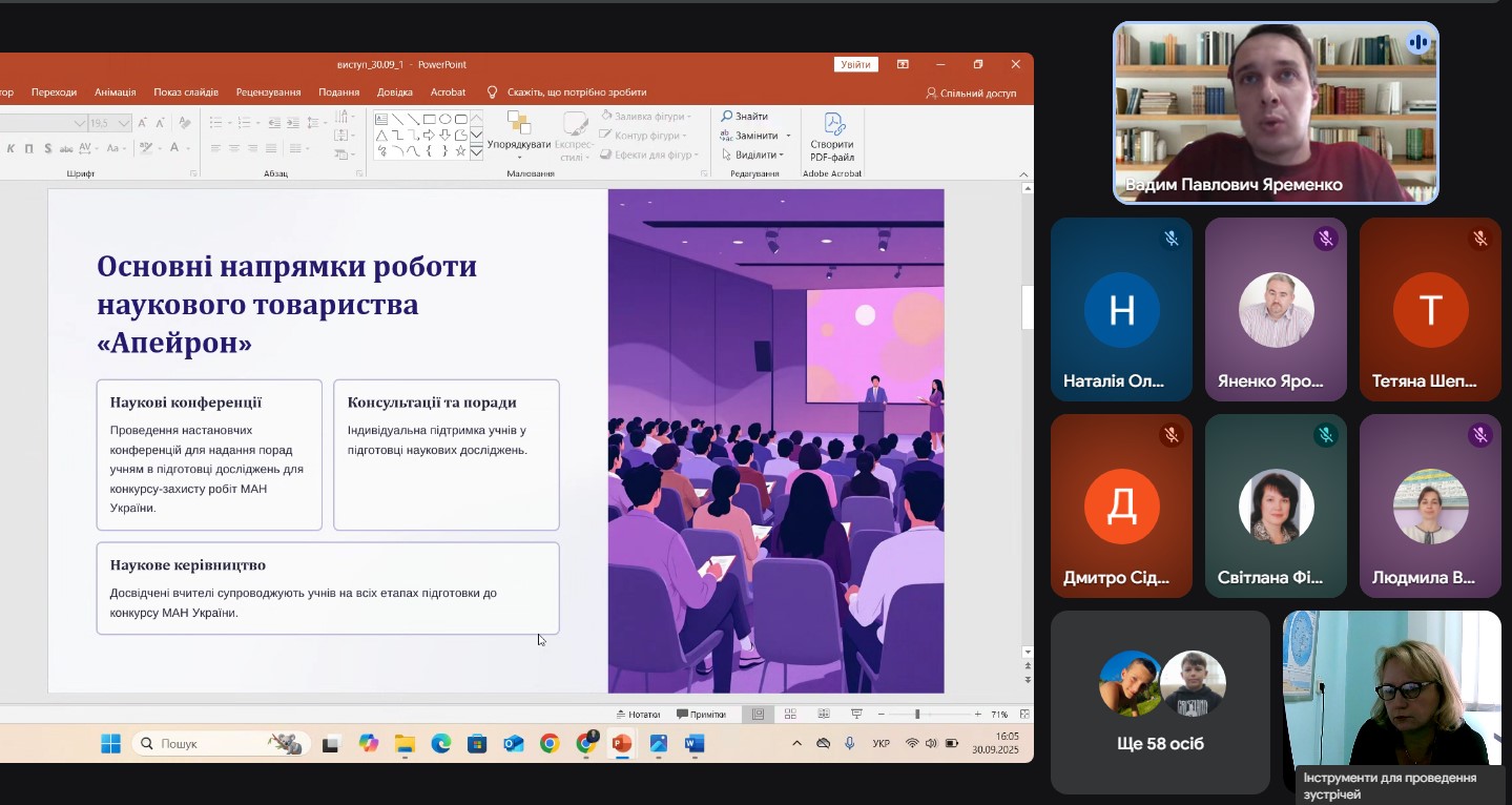 30 вересня 2025 р. к.п.н, доцент кафедри загальної та регіональної географії Король О.М. в якості запрошеного спікера прийняла участь у настановчій конференції наукового товариства «Апейрон» з доповіддю на тему «Візуалізація наукових досліджень: від інфографіки та інтерактивних презентацій до карт і ГІС.