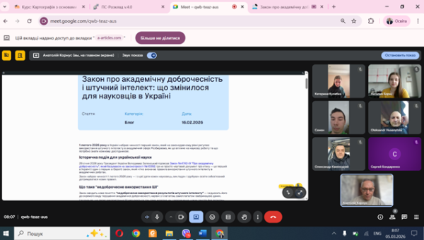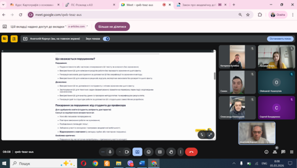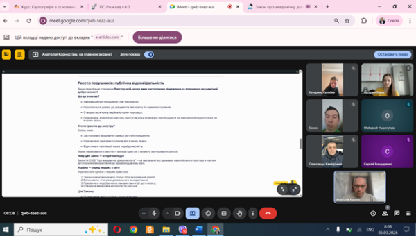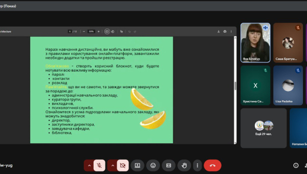 23 червня 2021 року к.г.н., доц., куратор 731 групи Корнус О.Г. провела кураторську годину із здобувачами вищої освіти. На зустрічі студенти обговорили результати літньої екзаменаційної практики, проаналізували проблеми та складнощі, які виникали під час освітнього процесу як у другому семестрі, так і за весь рік. Обговорили плани на наступний навчальний рік та прослухали інструктаж з безпеки життєдіяльності учасників освітнього процесу під час літніх канікул.